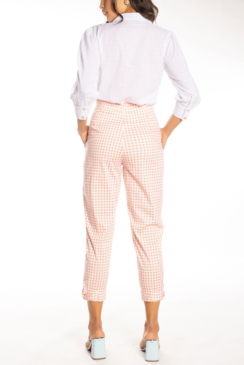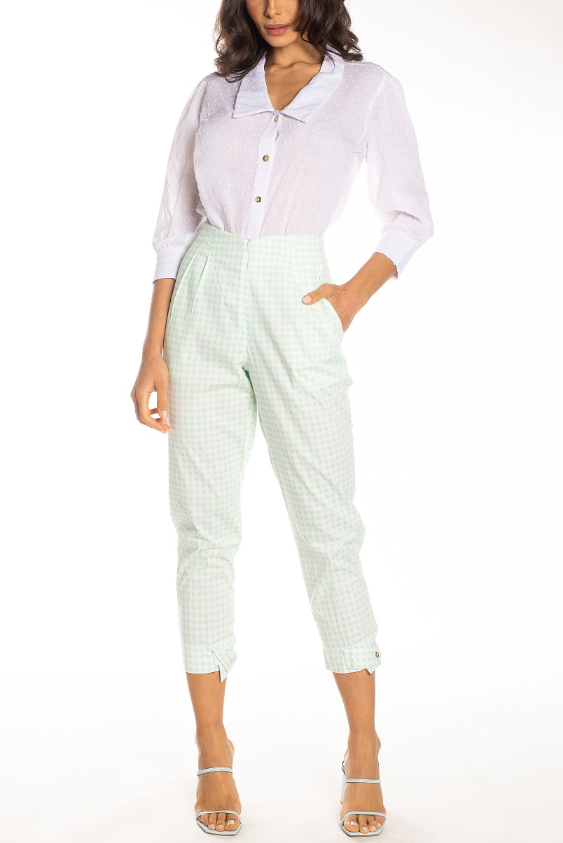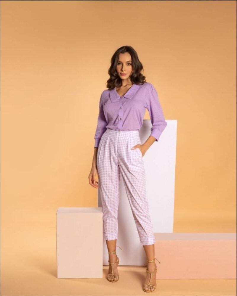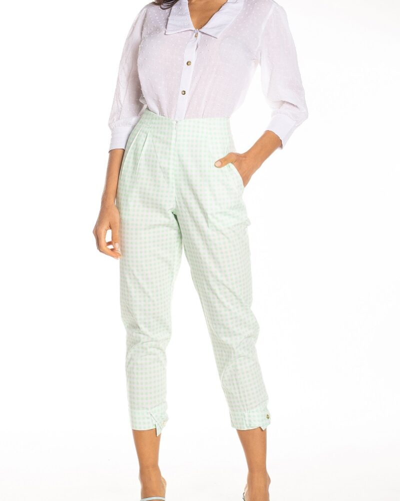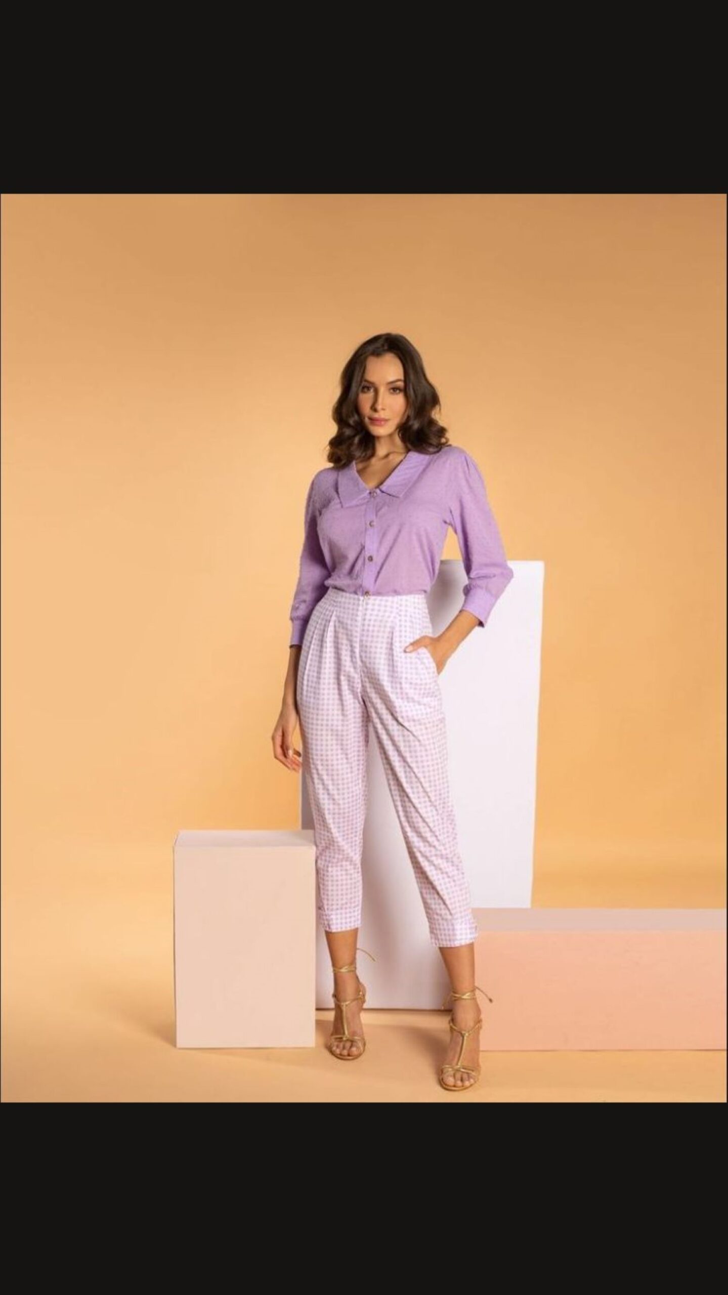 Calça em tricoline com elastano, corte em alfaiataria, bolso faca, fechamento de zíper invisível, detalhe de abotoamento na barra da calça.