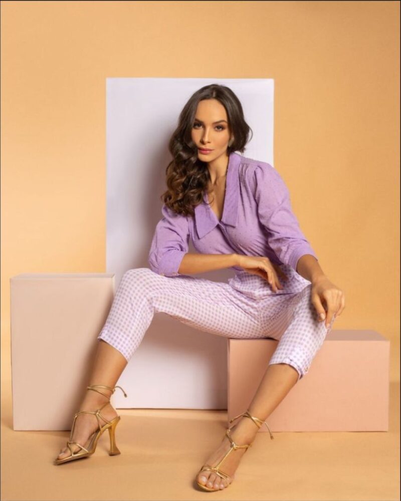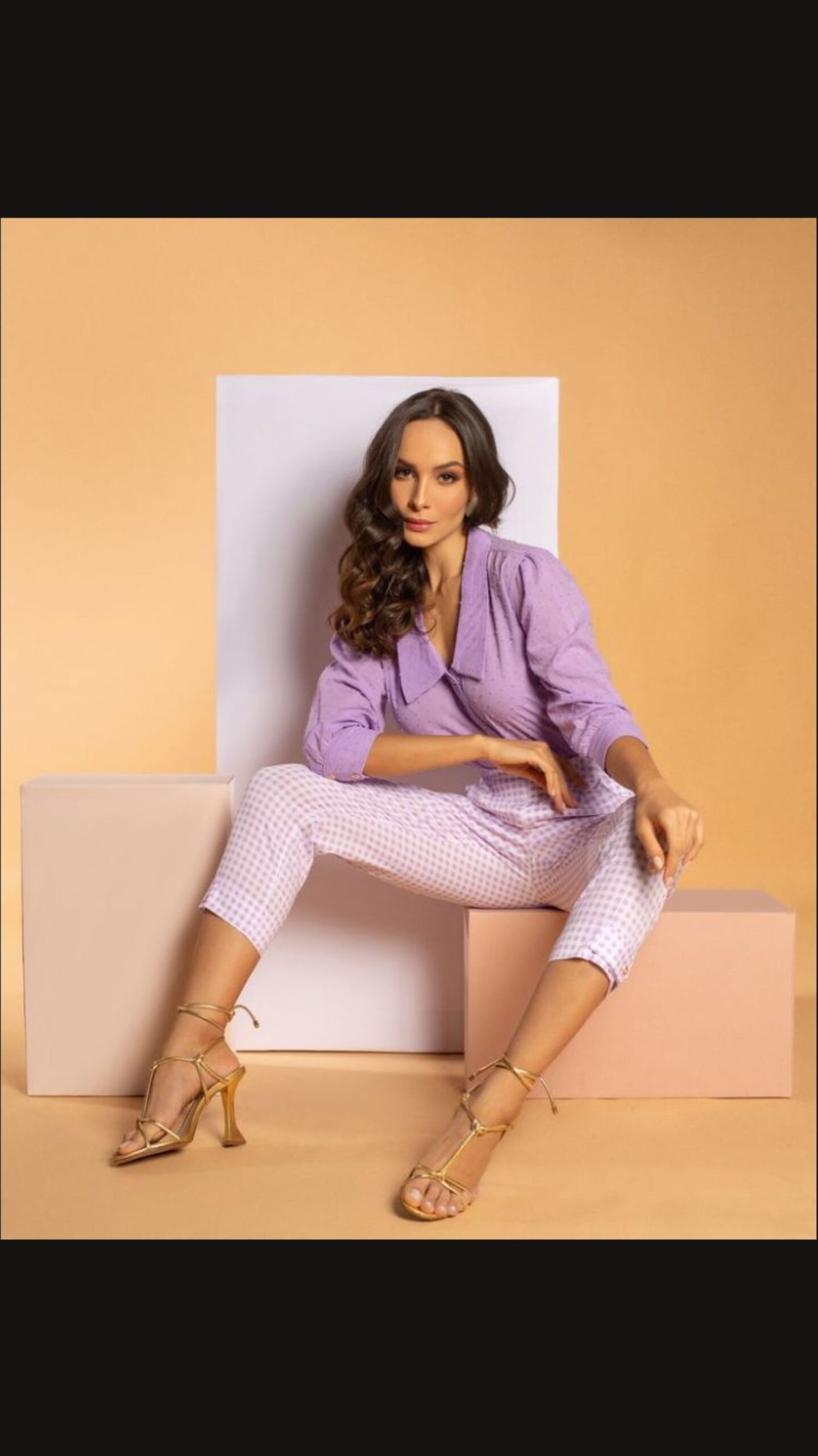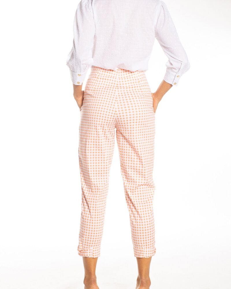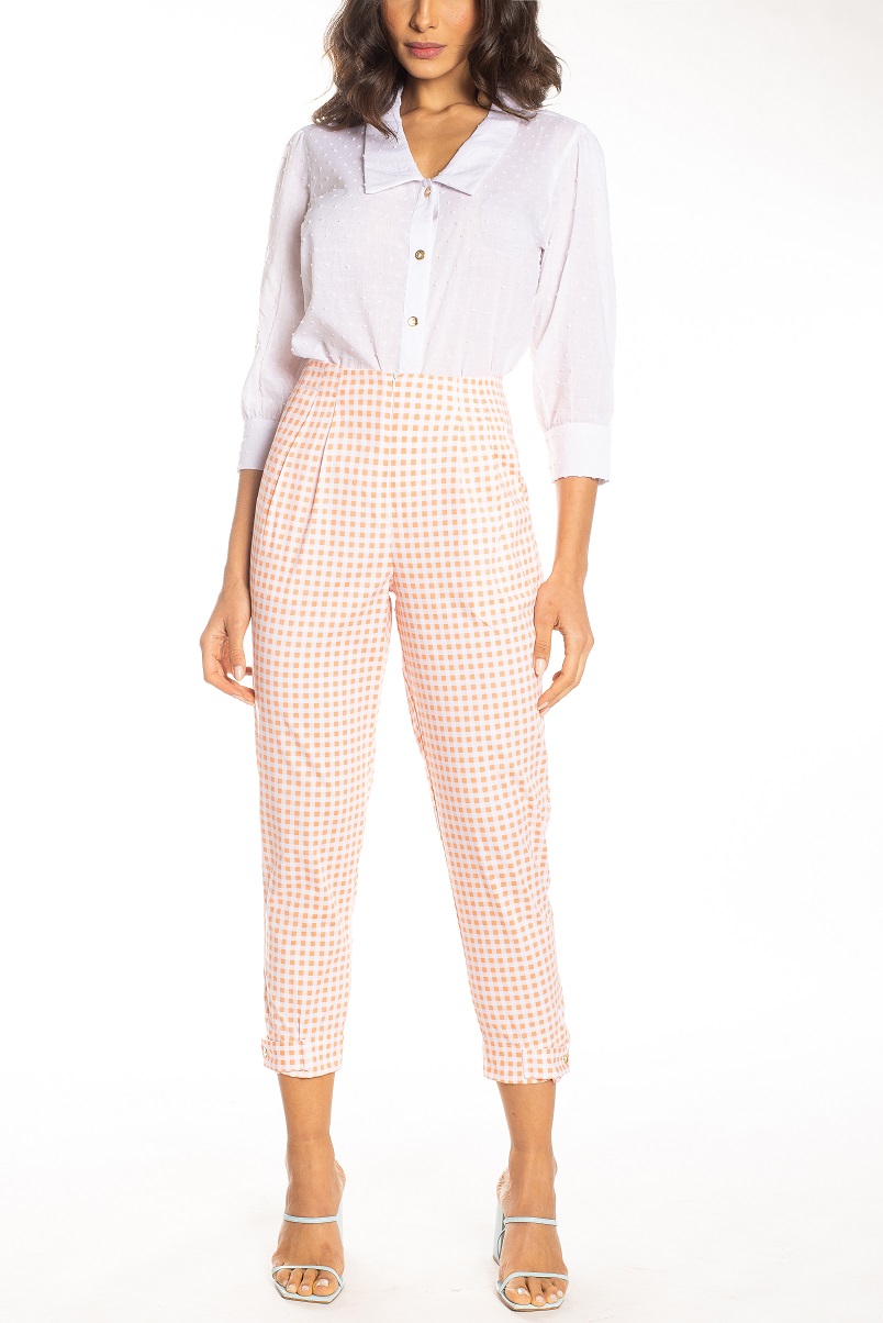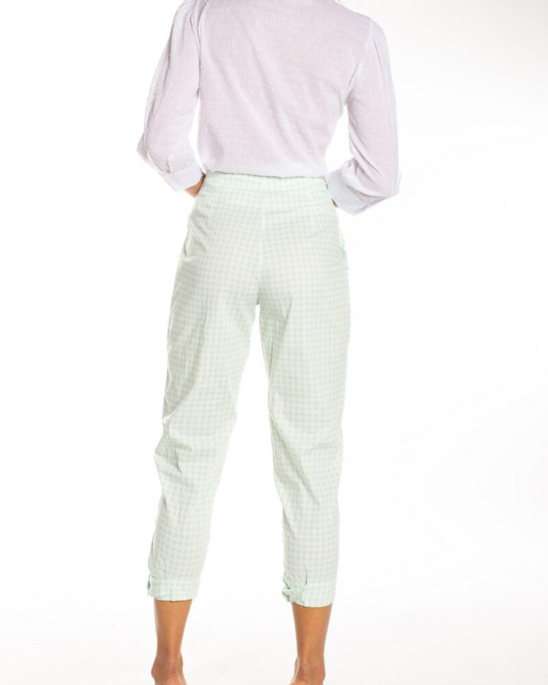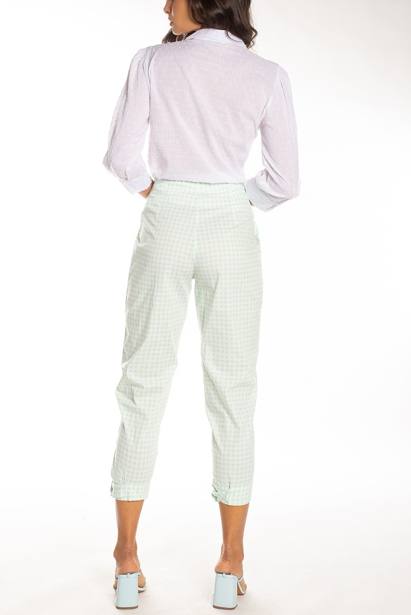 Calça em tricoline com elastano, corte em alfaiataria, bolso faca, fechamento de zíper invisível, detalhe de abotoamento na barra da calça.