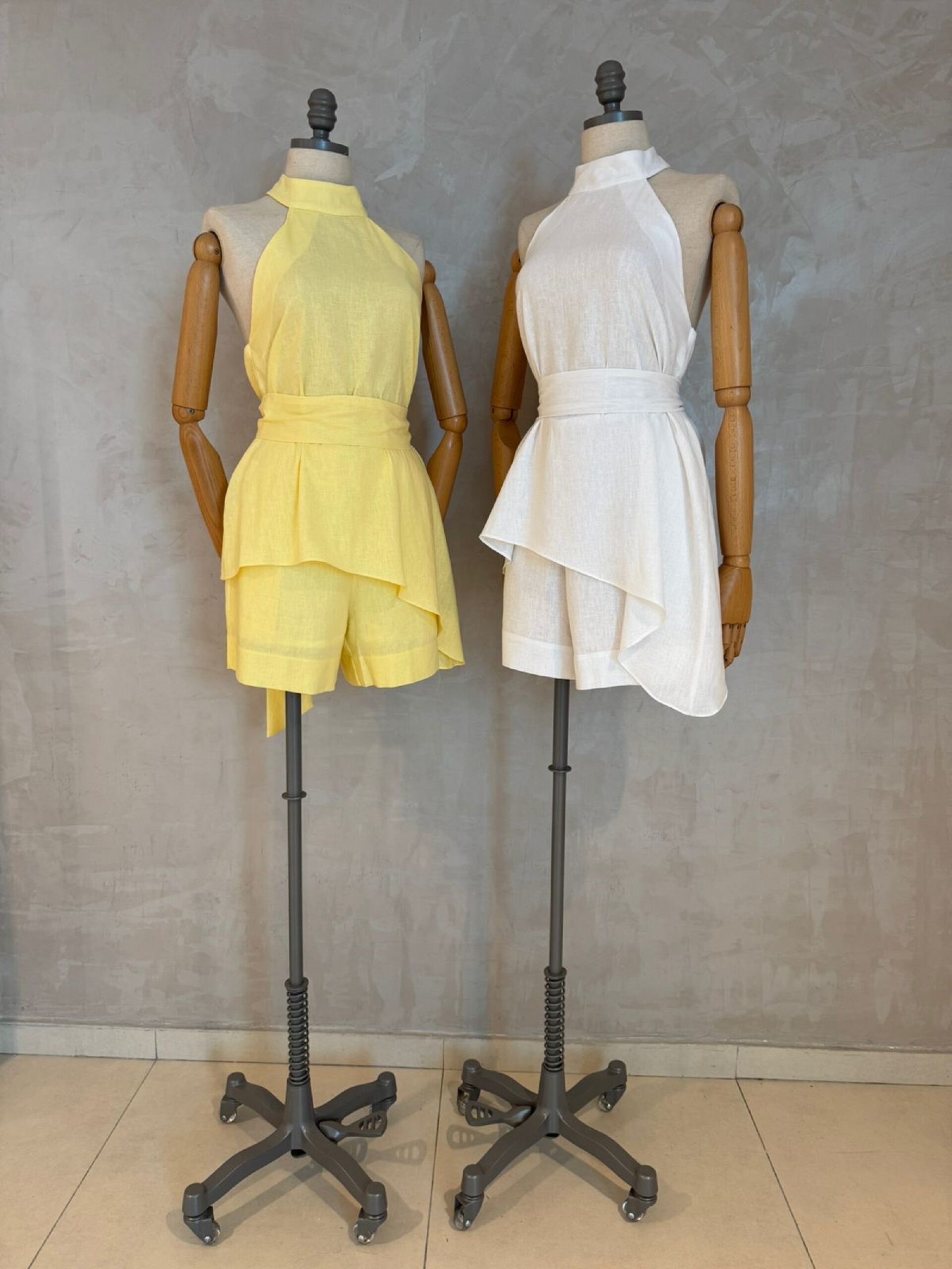 Elegante na medida certa, com o frescor que a estação pede! Com o short forrado para trazer mais conforto ao vestir e a praticidade dos fechos em zíper, não existe momento errado para o conjunto Alda, tendo ele no branco e no amarelo, permitindo ser utilizada em múltiplas ocasiões.