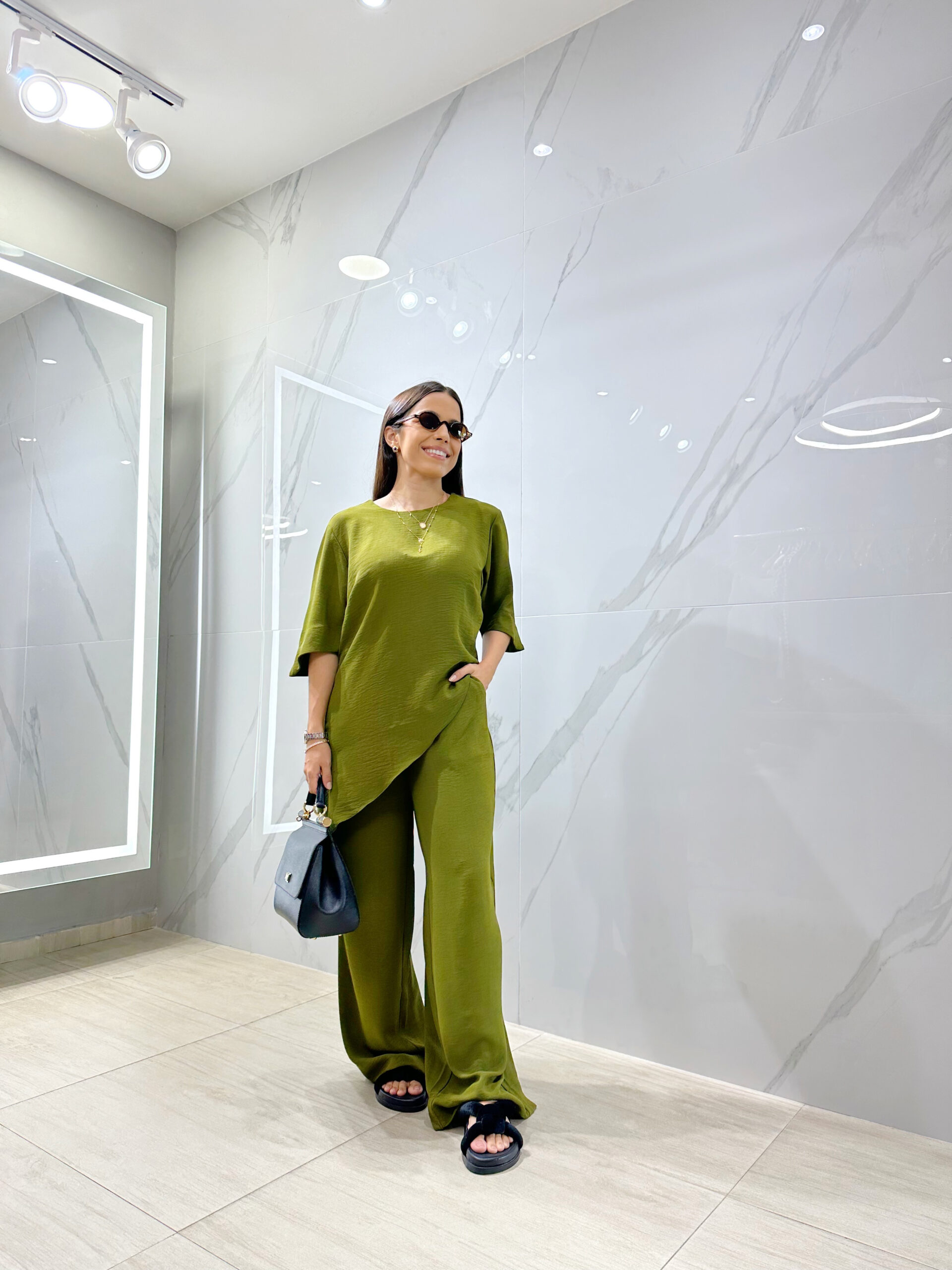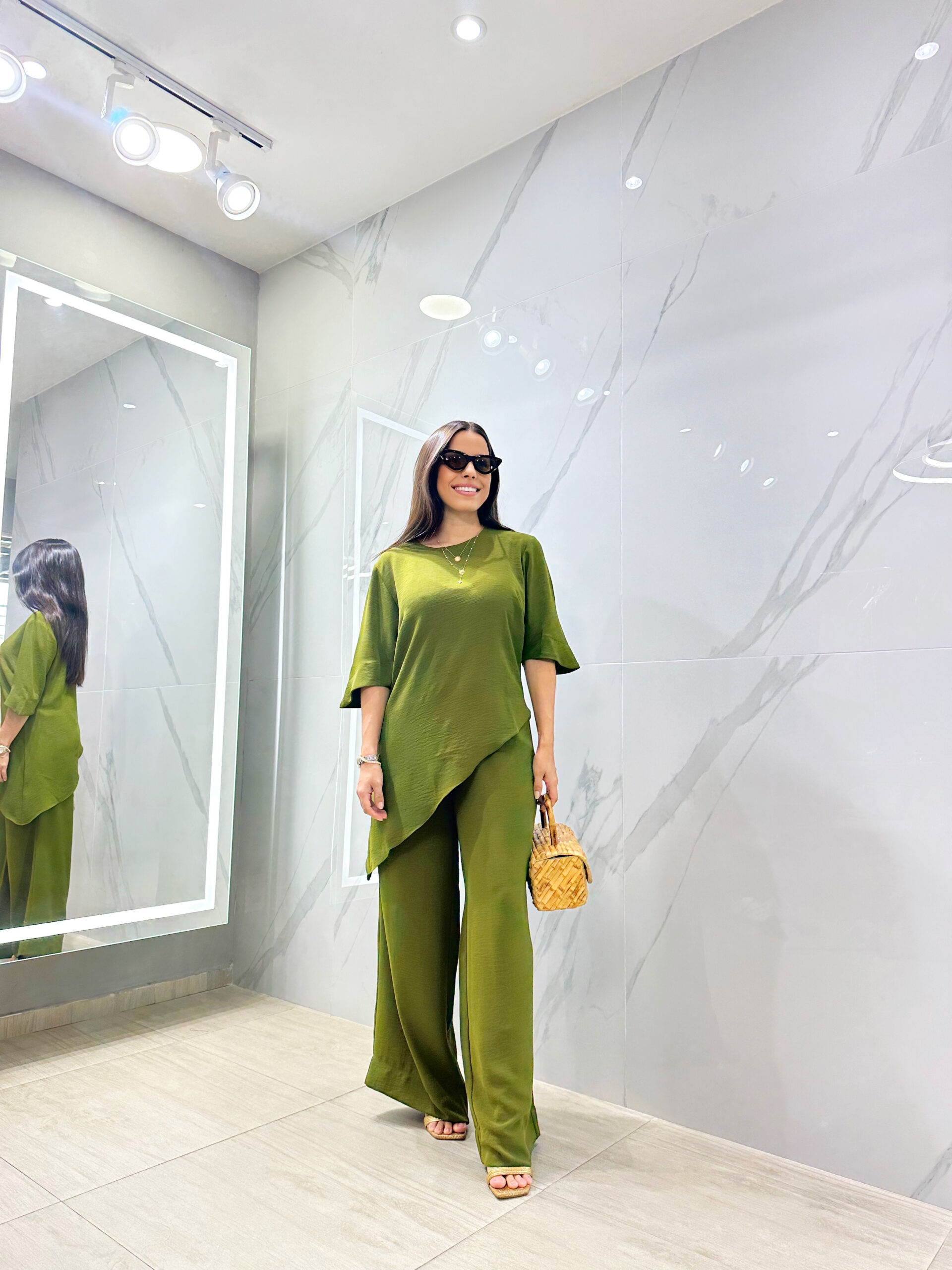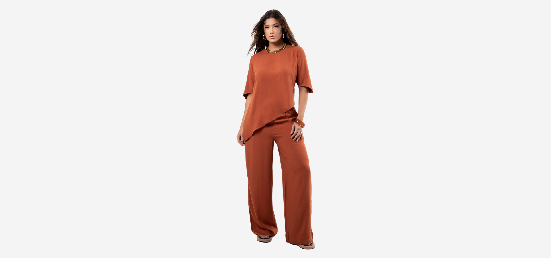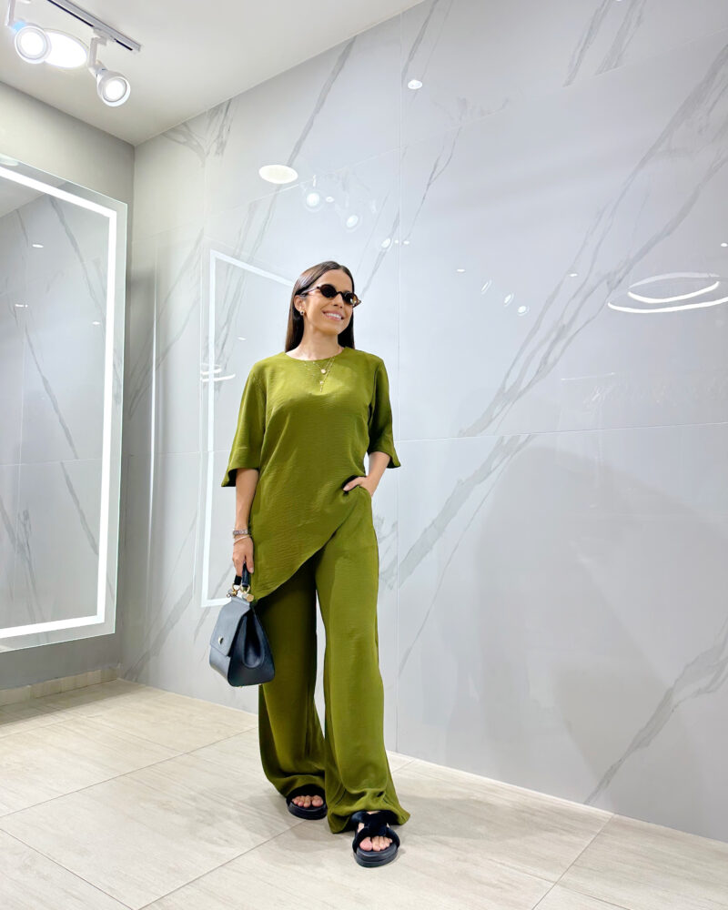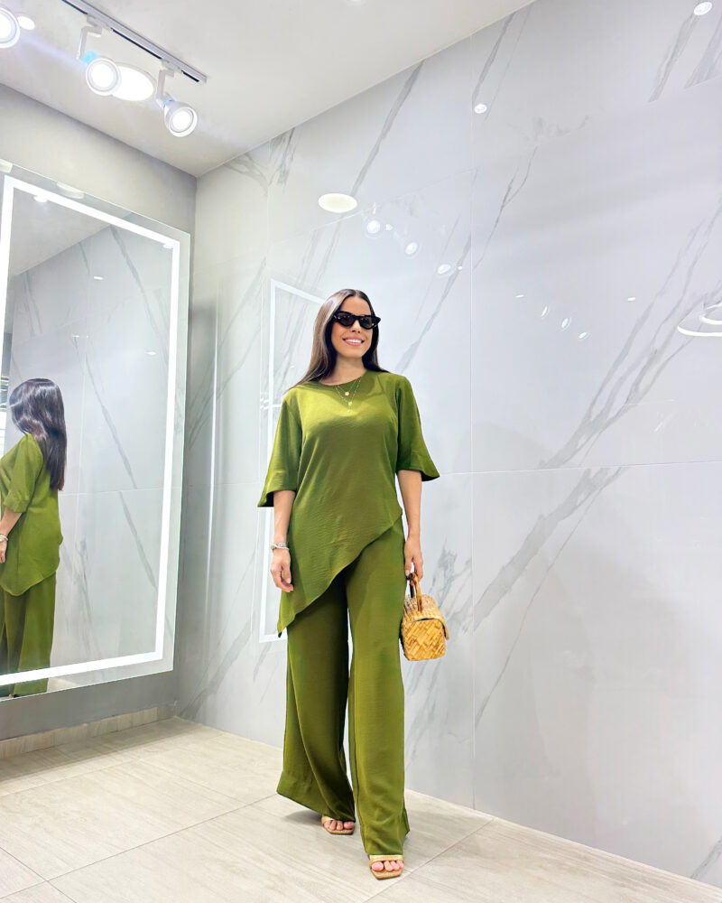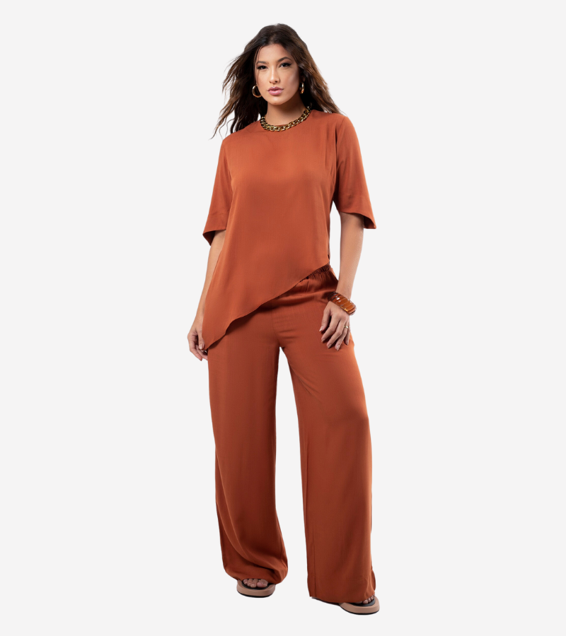 Conjunto composto por calça pantalona e blusa com assimetria na barra.