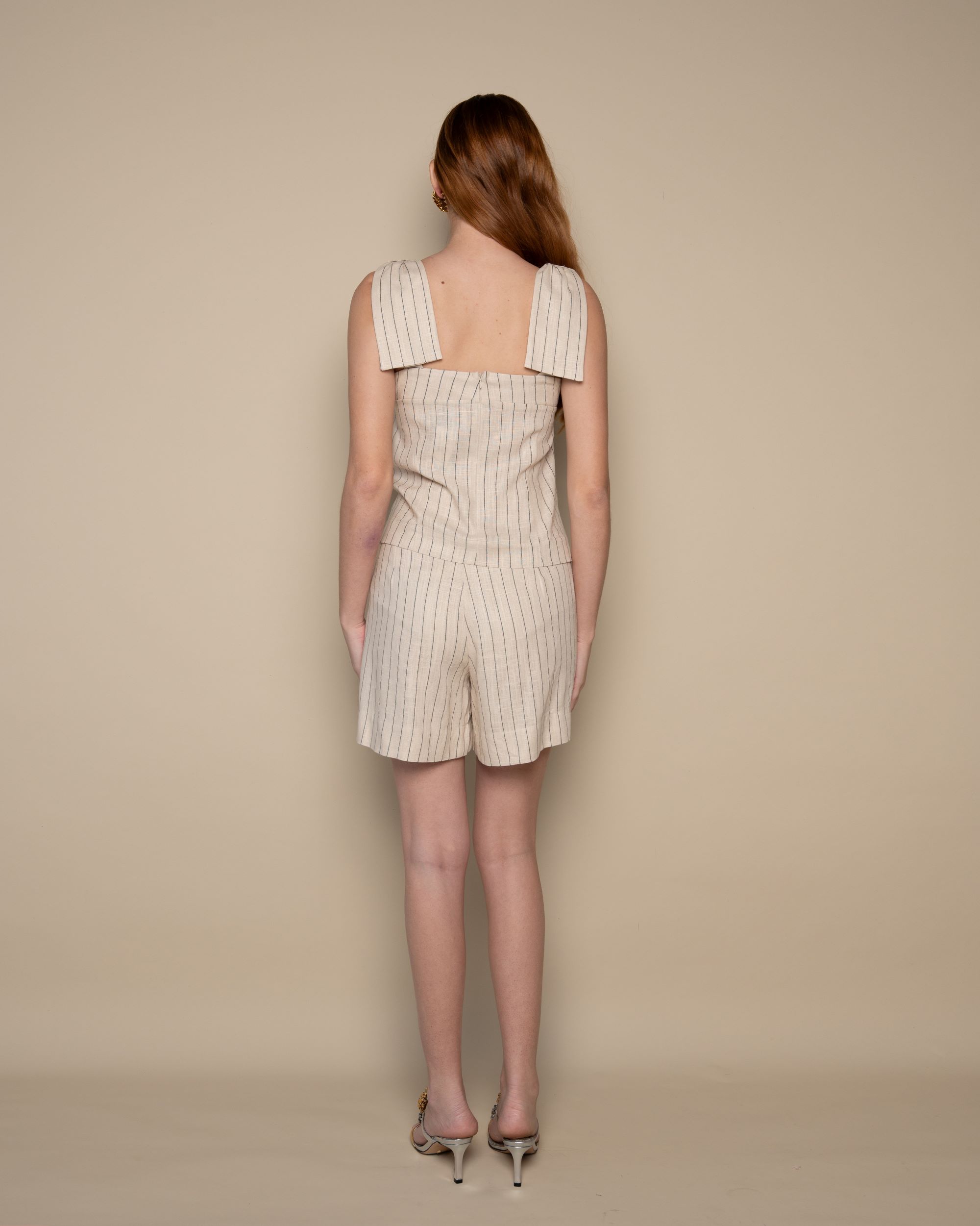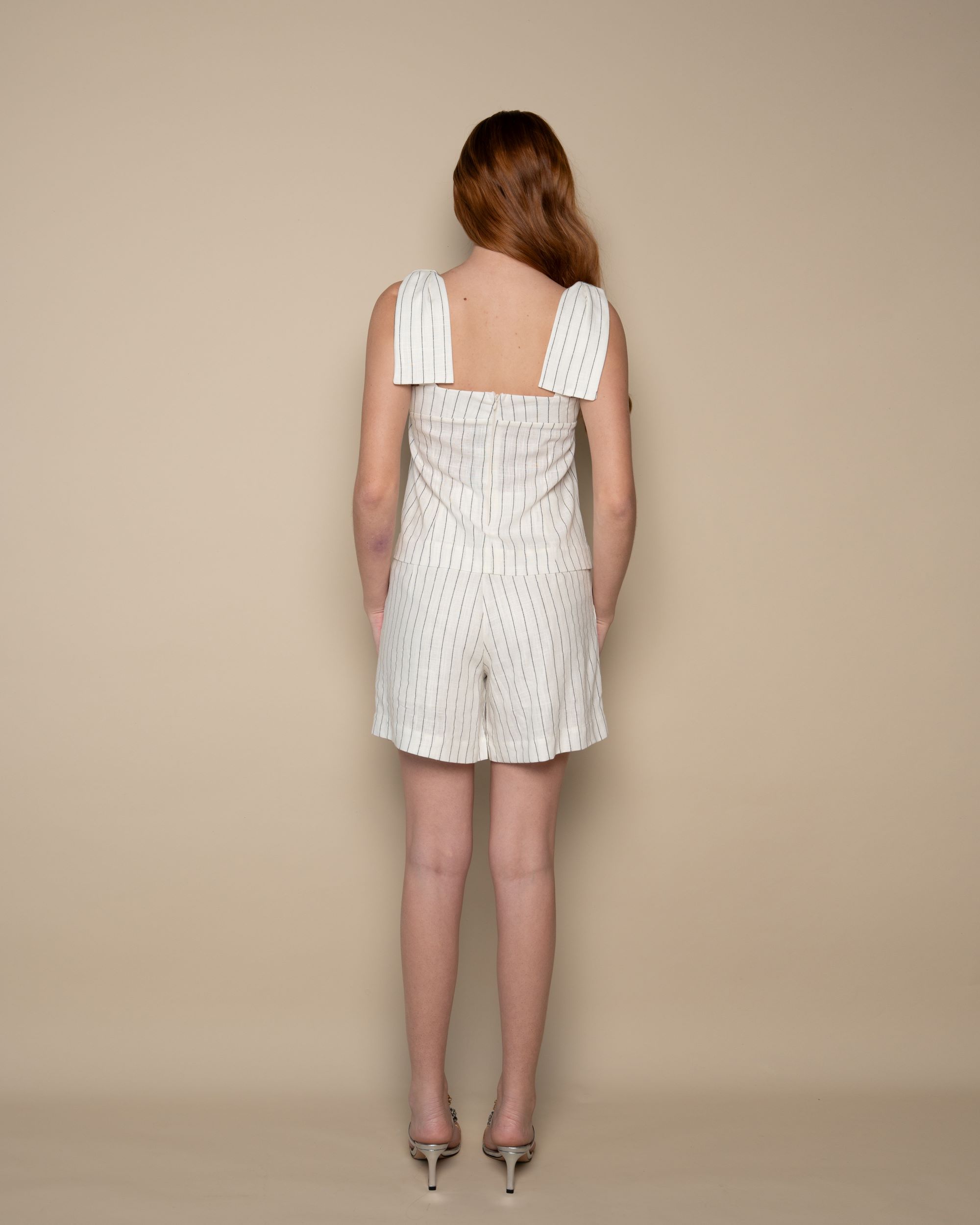 Conjunto em alfaiataria risca de giz, composto por blusa com decote reto, detalhe de laços nas alças e short social com zíper e botões frontais embutidos.