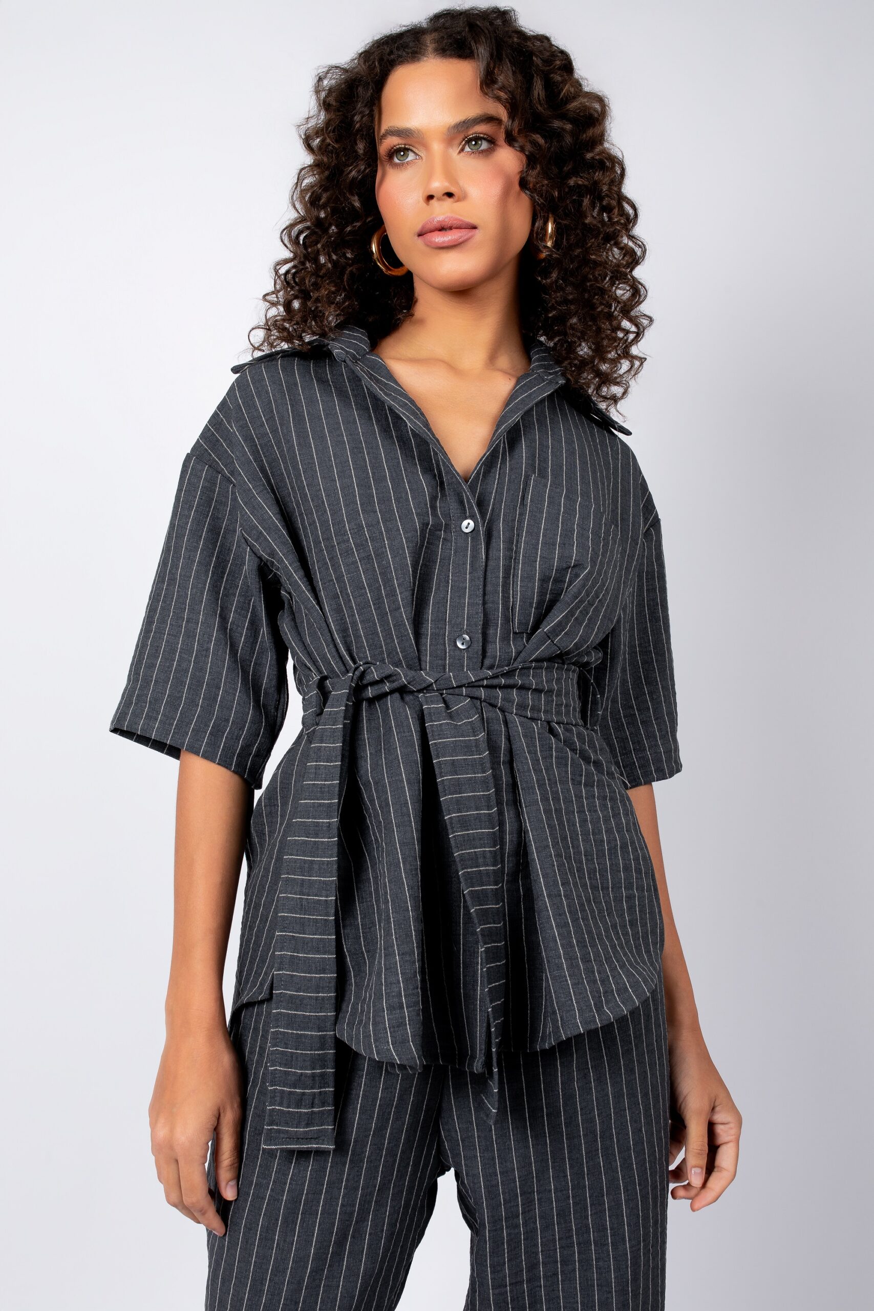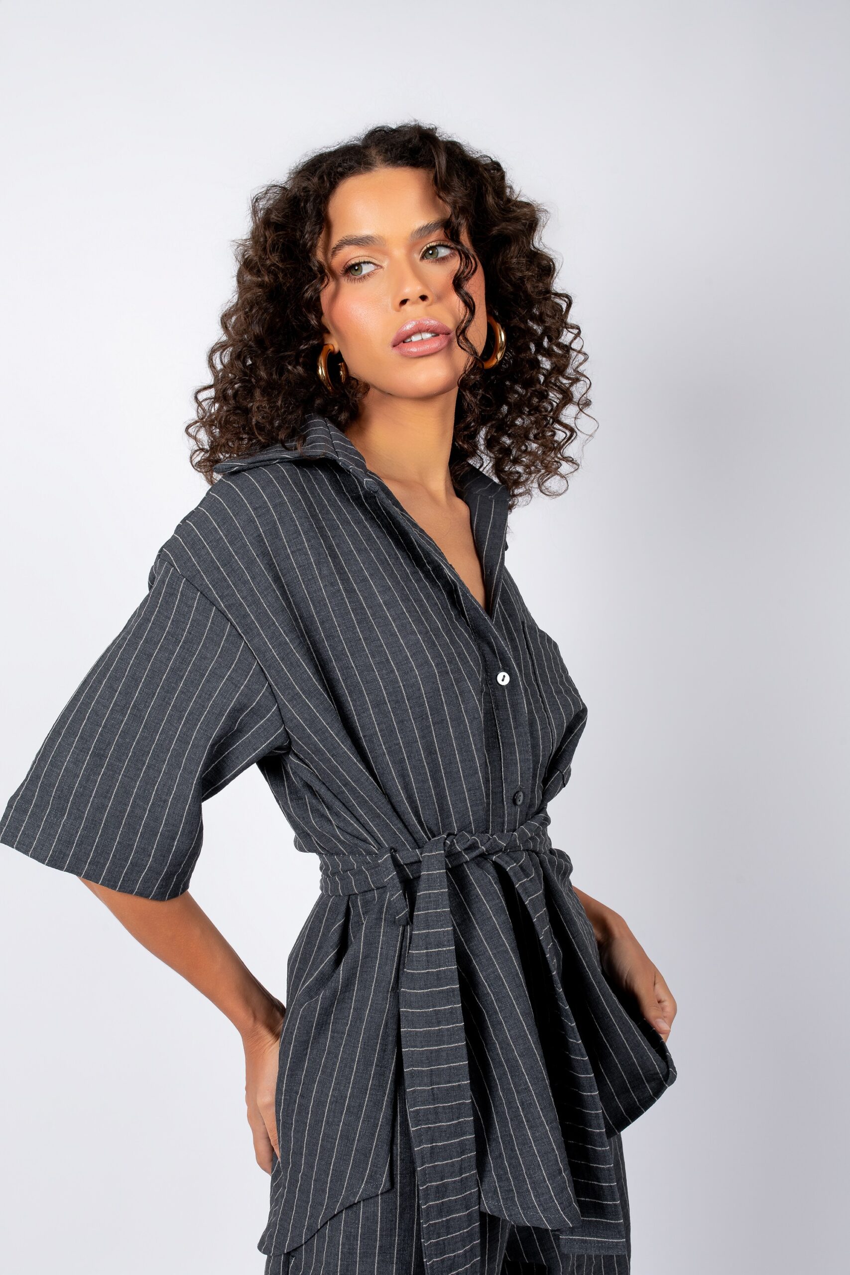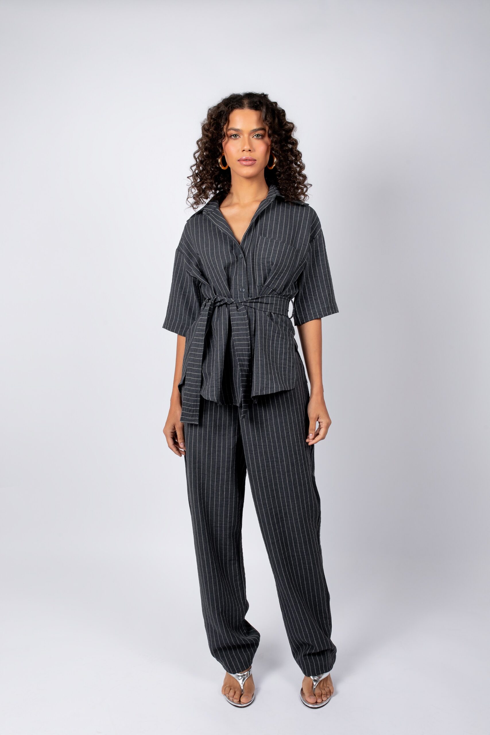 Camisa de botão com manga curta, bolso frontal na altura do colo e passadores de cinto na cintura e Calça pantalona com cós estilo boxer.