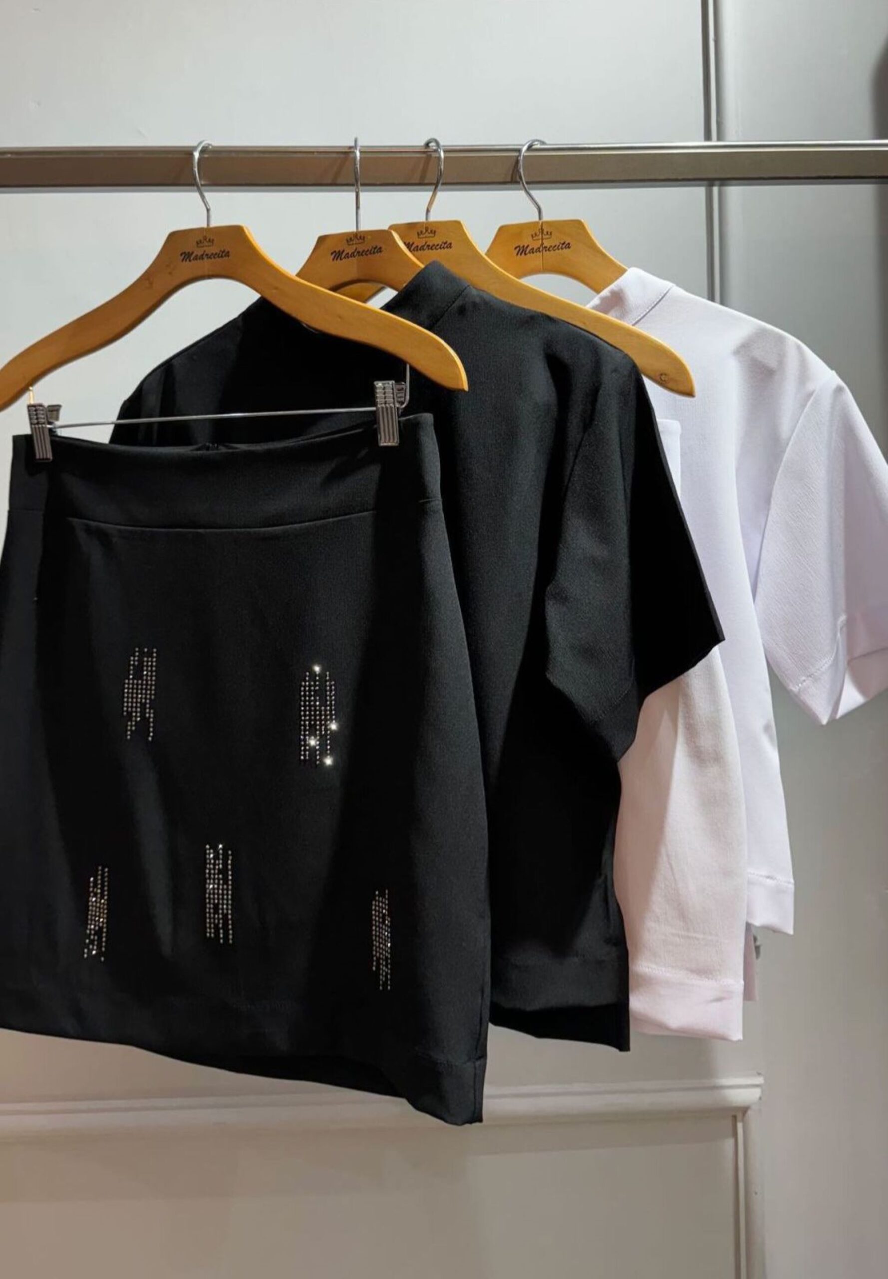 Conjunto sofisticado composto por uma blusa lisa de caimento leve, com costas alongadas para um toque moderno, e uma saia curta com cós de elástico, realçada por detalhes aplicados em brilhos para um charme extra.
