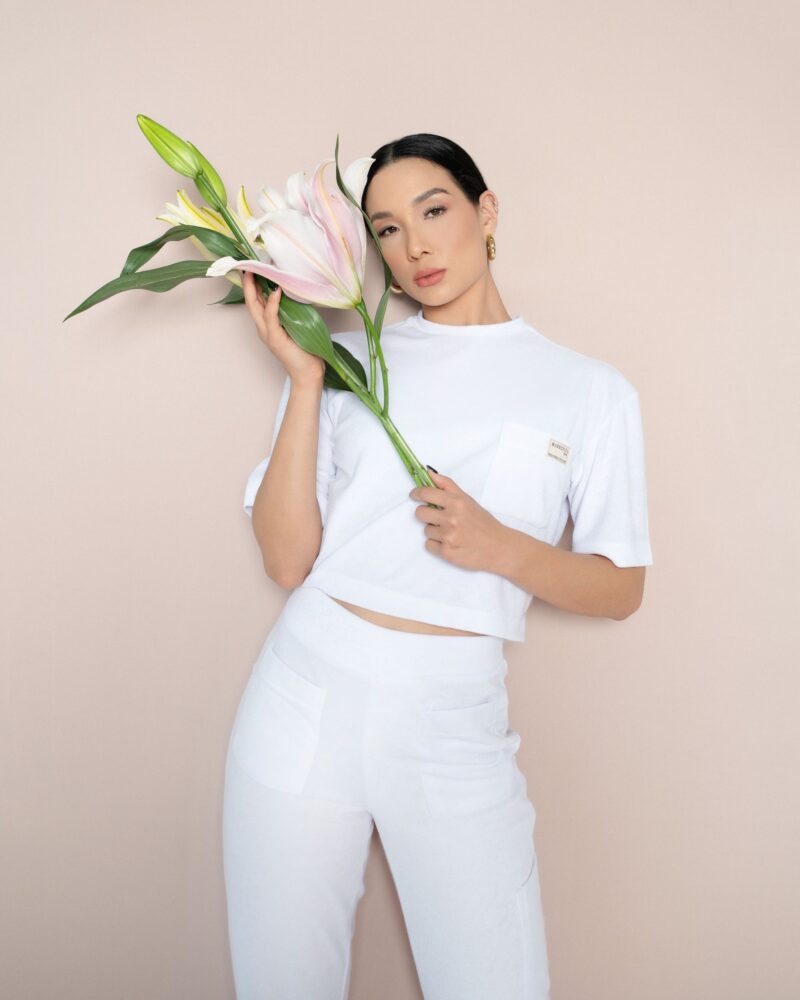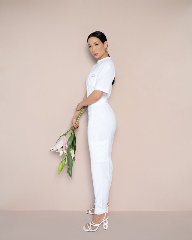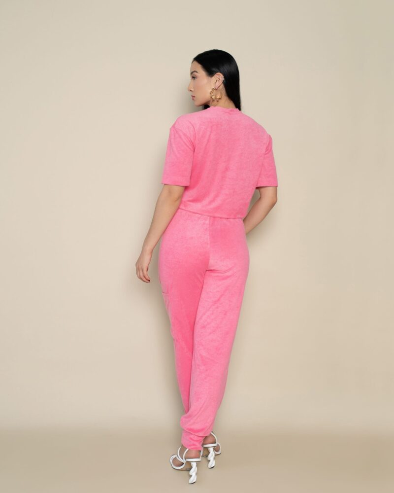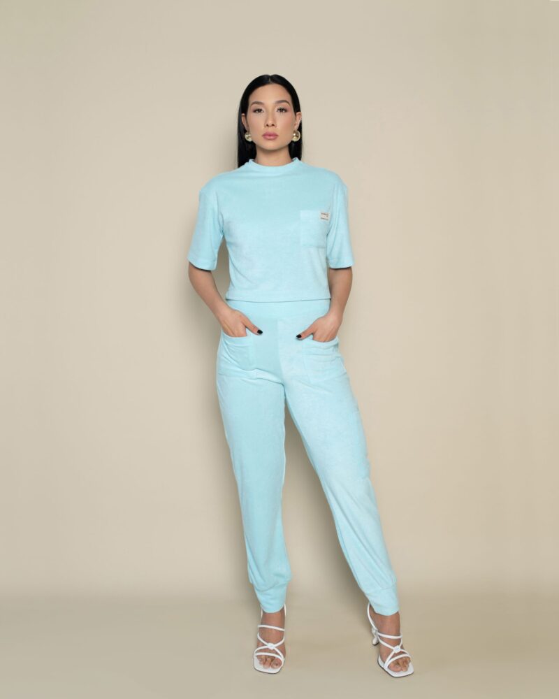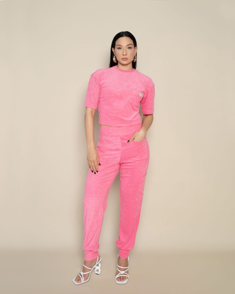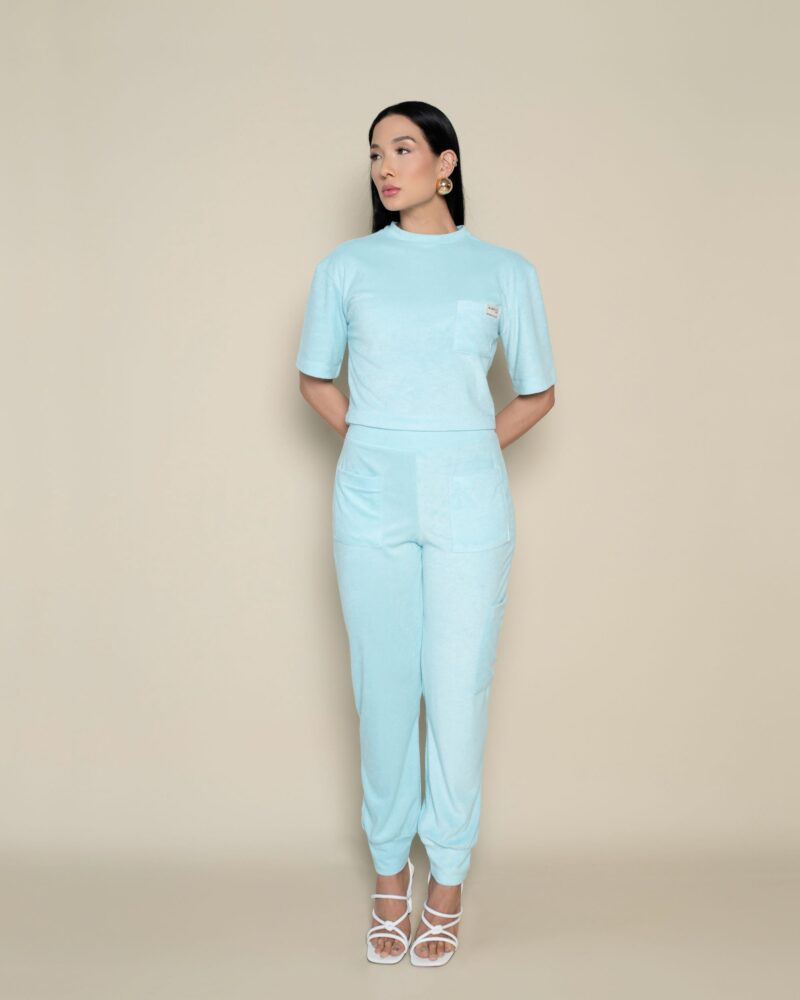 Conjunto de tecido atoalhado composto por calça e blusa.