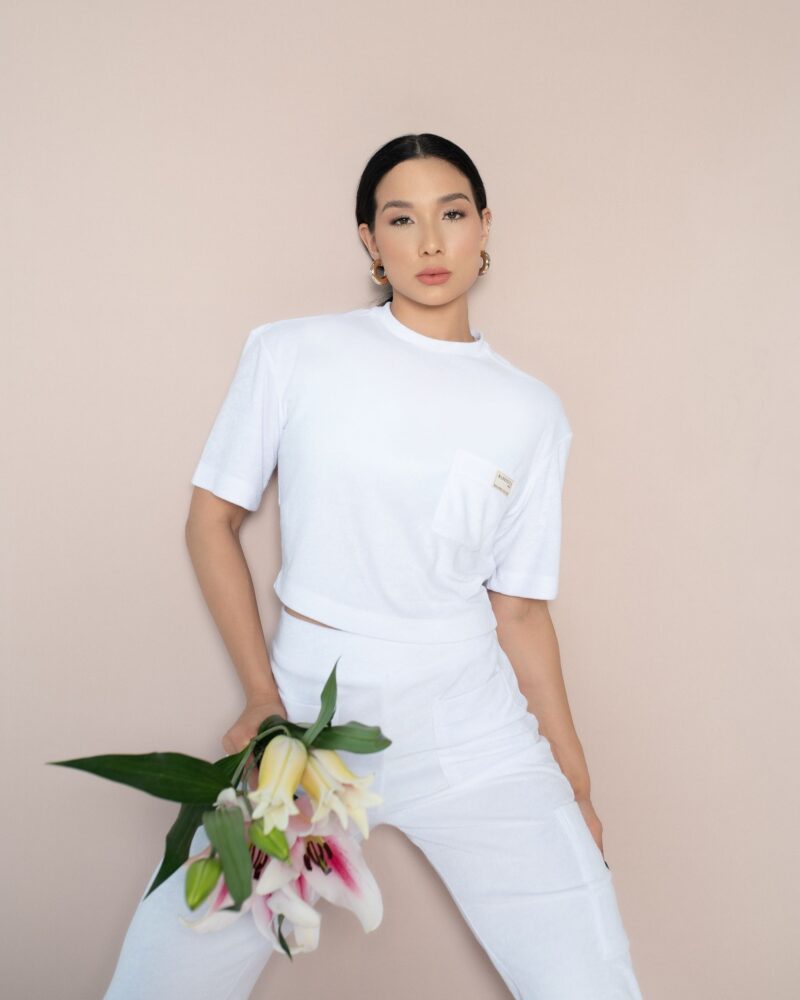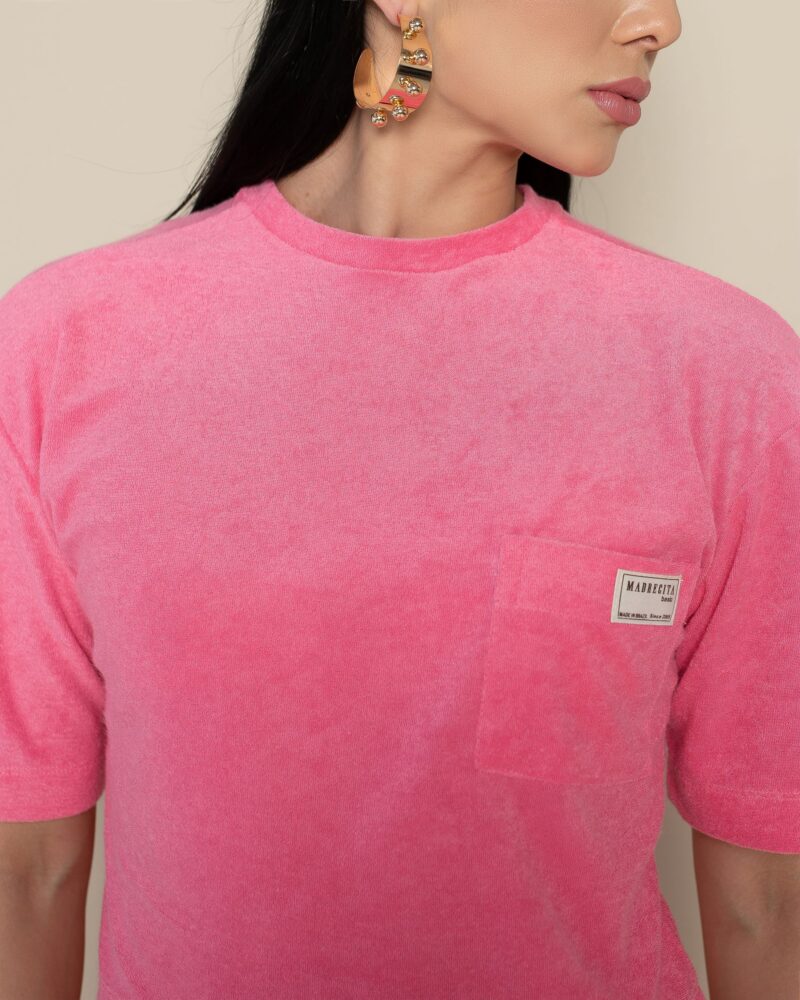 Blusa modelo básico, com detalhe da etiqueta personalizada no bolso frontal.