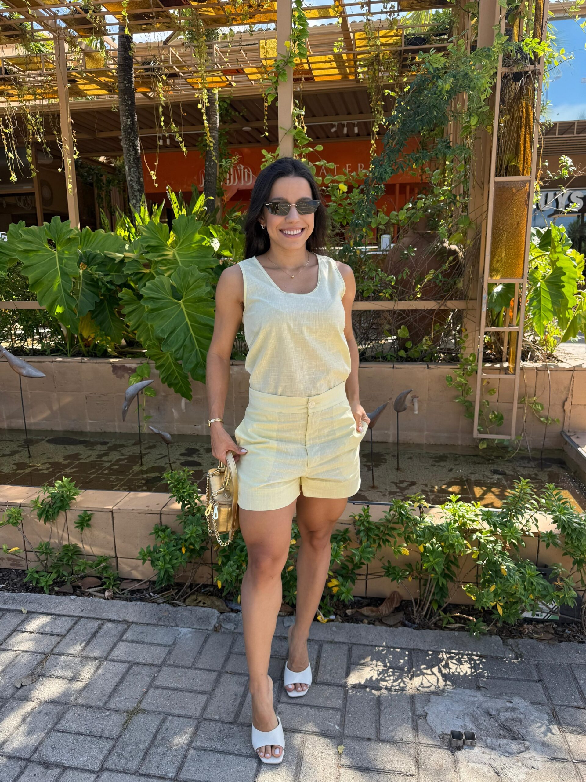 Blusa regata de alças largas e caimento reto e short tipo alfaiataria de cintura alta e bolsos laterais.