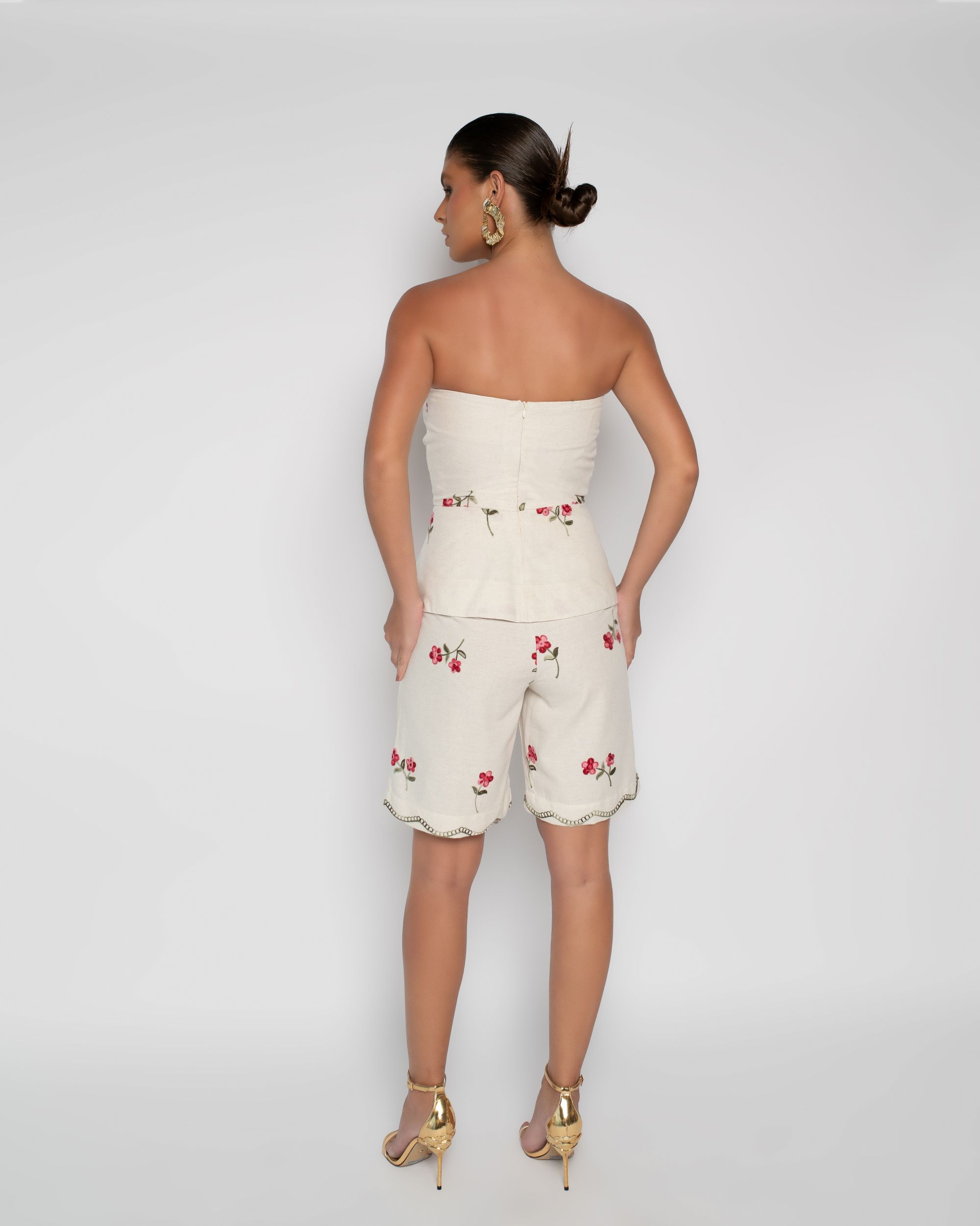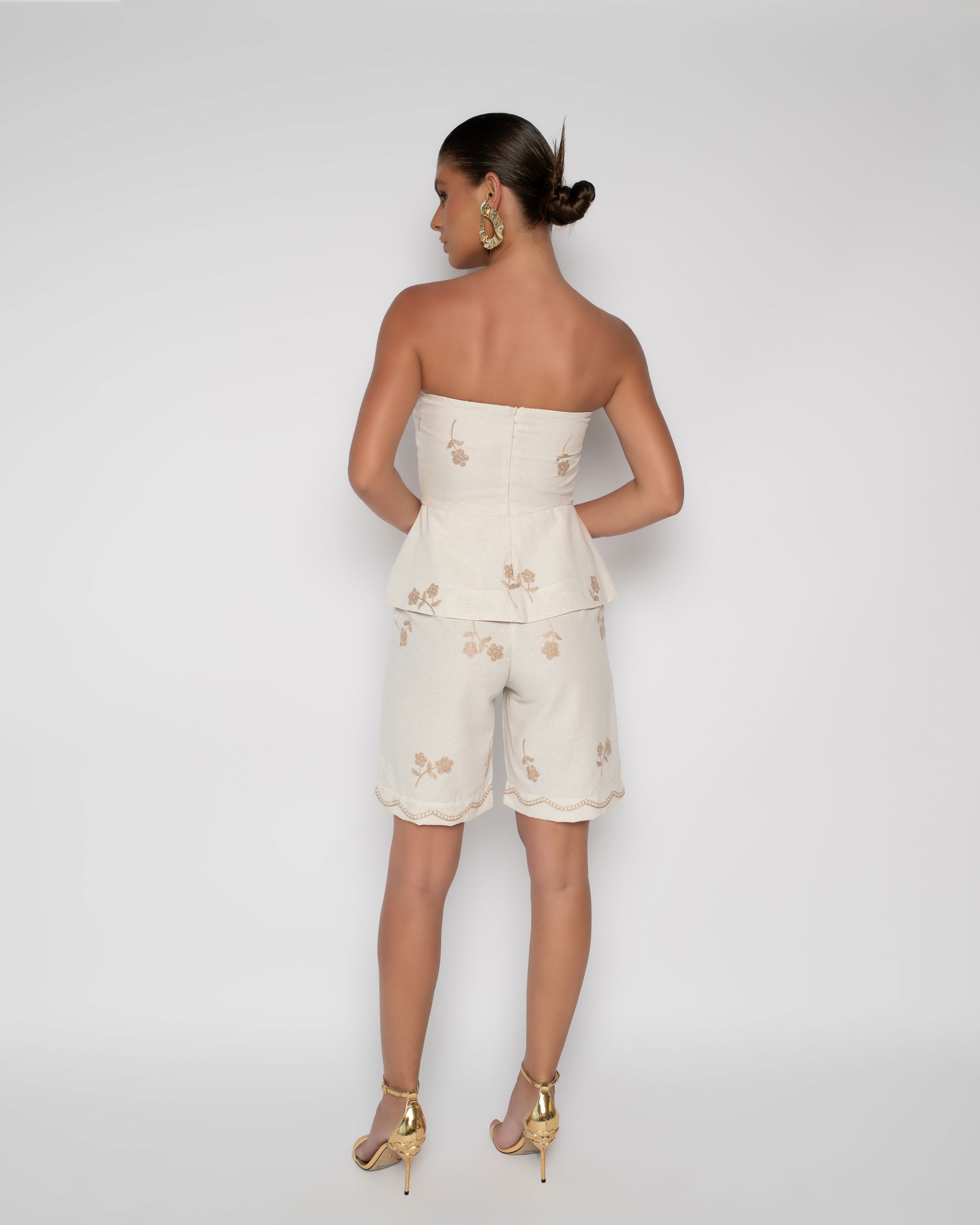 Conjunto em linho bordado de peplum e bermuda com comprimento acima do joelho;