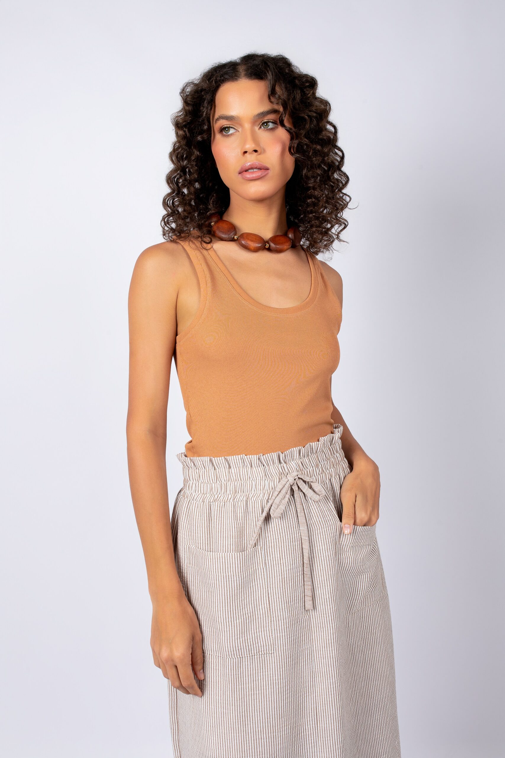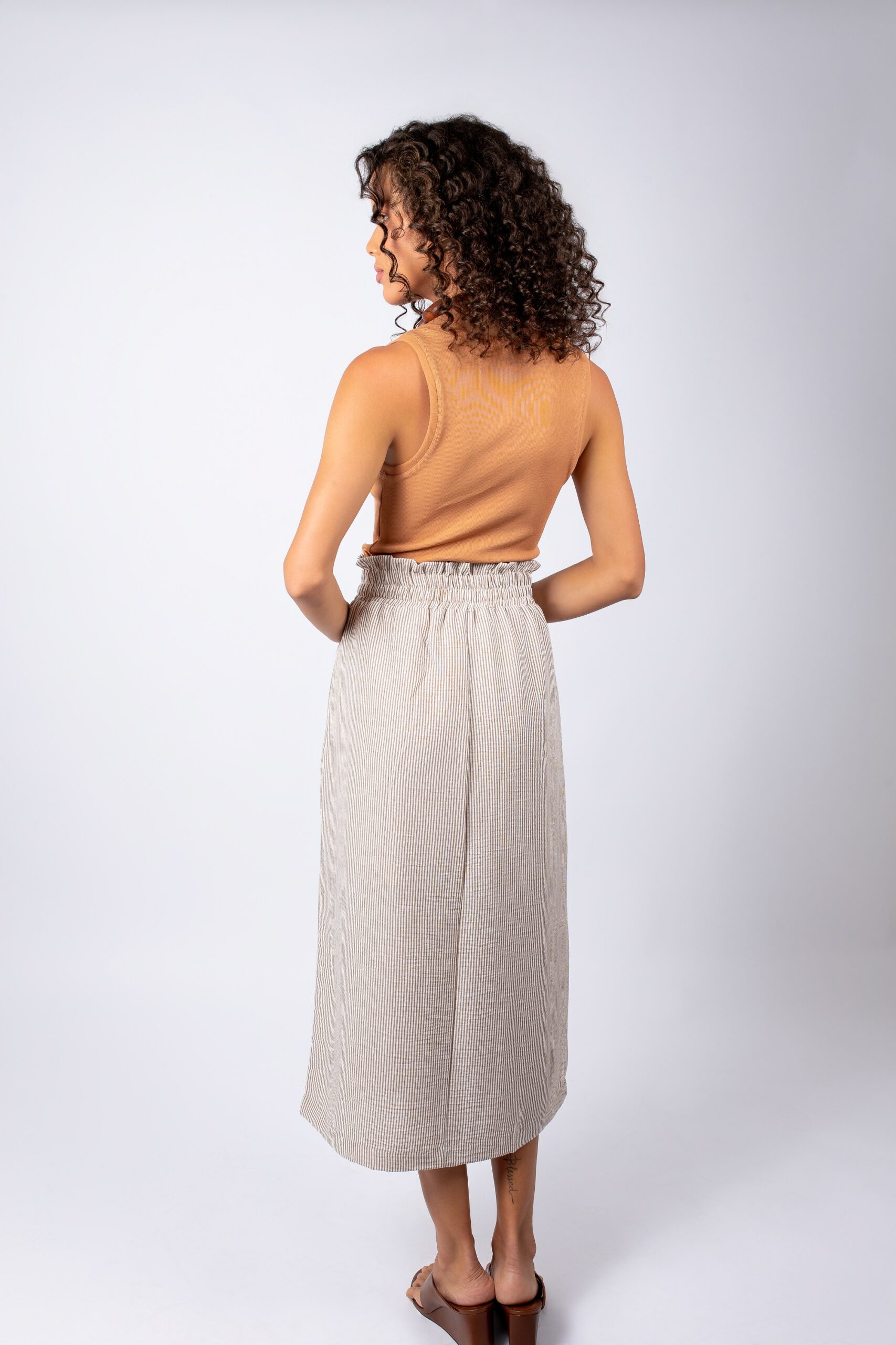 Saia midi com bolsos frontais, cós elástico com detalhe de amarração e fenda frontal.