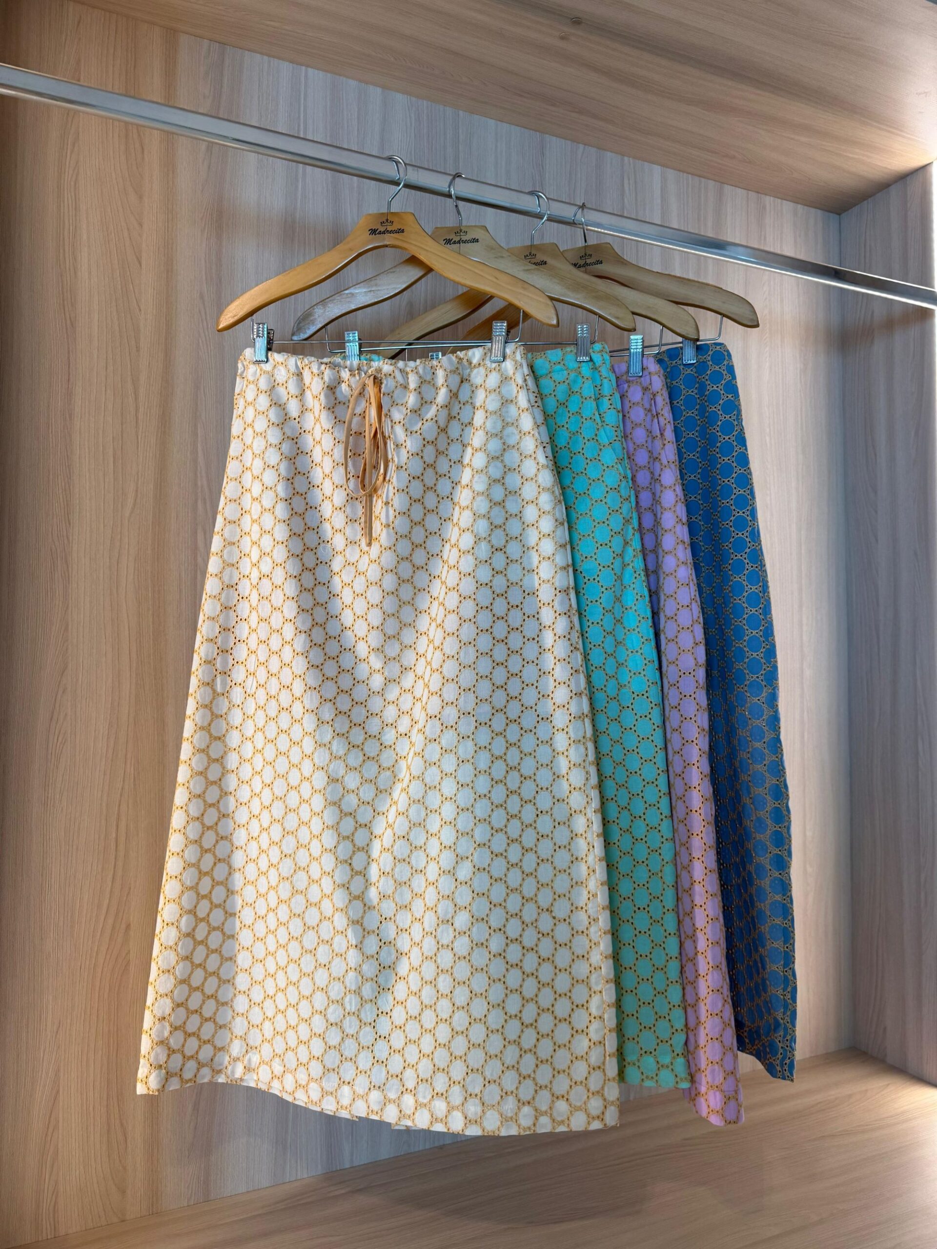 Saia midi leve e fluida, com estampa geométrica sofisticada e detalhes metalizados que trazem um toque de brilho sutil. Possui cós ajustável com amarração, garantindo conforto e versatilidade para diferentes silhuetas. Disponível em diversas cores delicadas, é a escolha perfeita para composições elegantes e modernas, seja para o dia ou a noite.