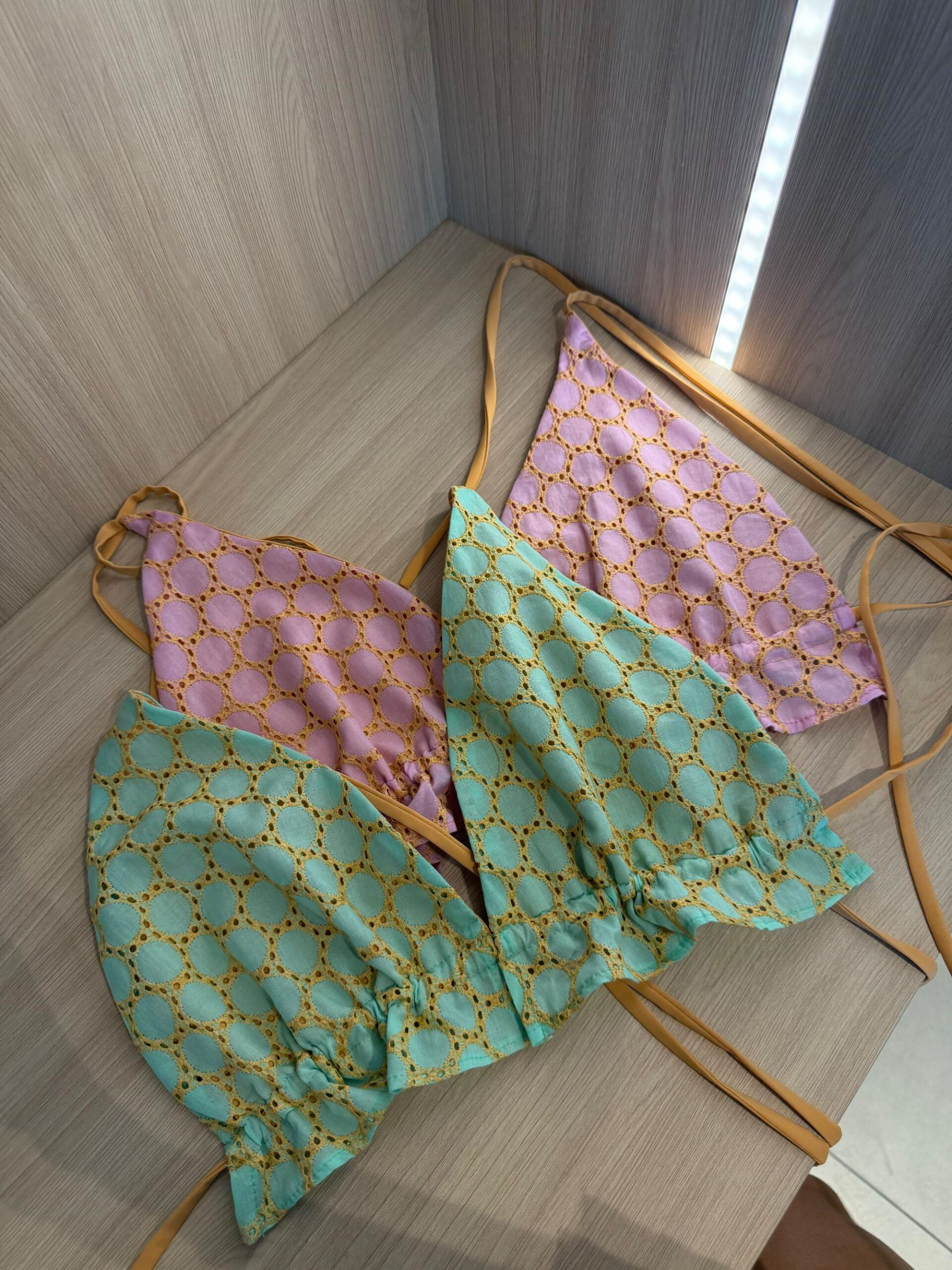 Top estilo cropped com modelagem triangular e amarração ajustável no pescoço e nas costas, proporcionando um ajuste perfeito e confortável. Confeccionado em tecido leve, possui estampa geométrica sofisticada com detalhes metalizados que trazem um toque de brilho delicado. Disponível em cores suaves e elegantes, é a peça ideal para compor looks frescos e modernos.