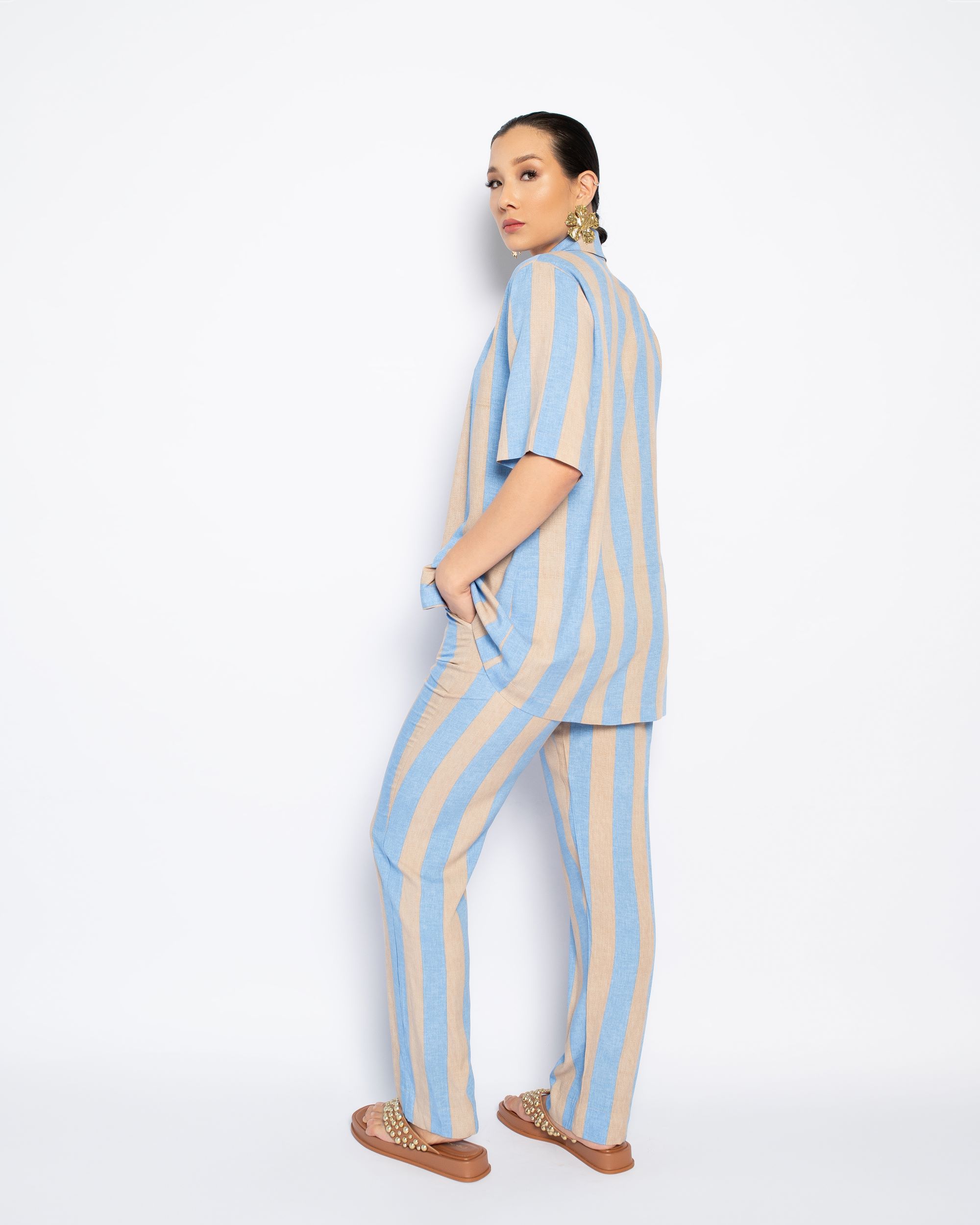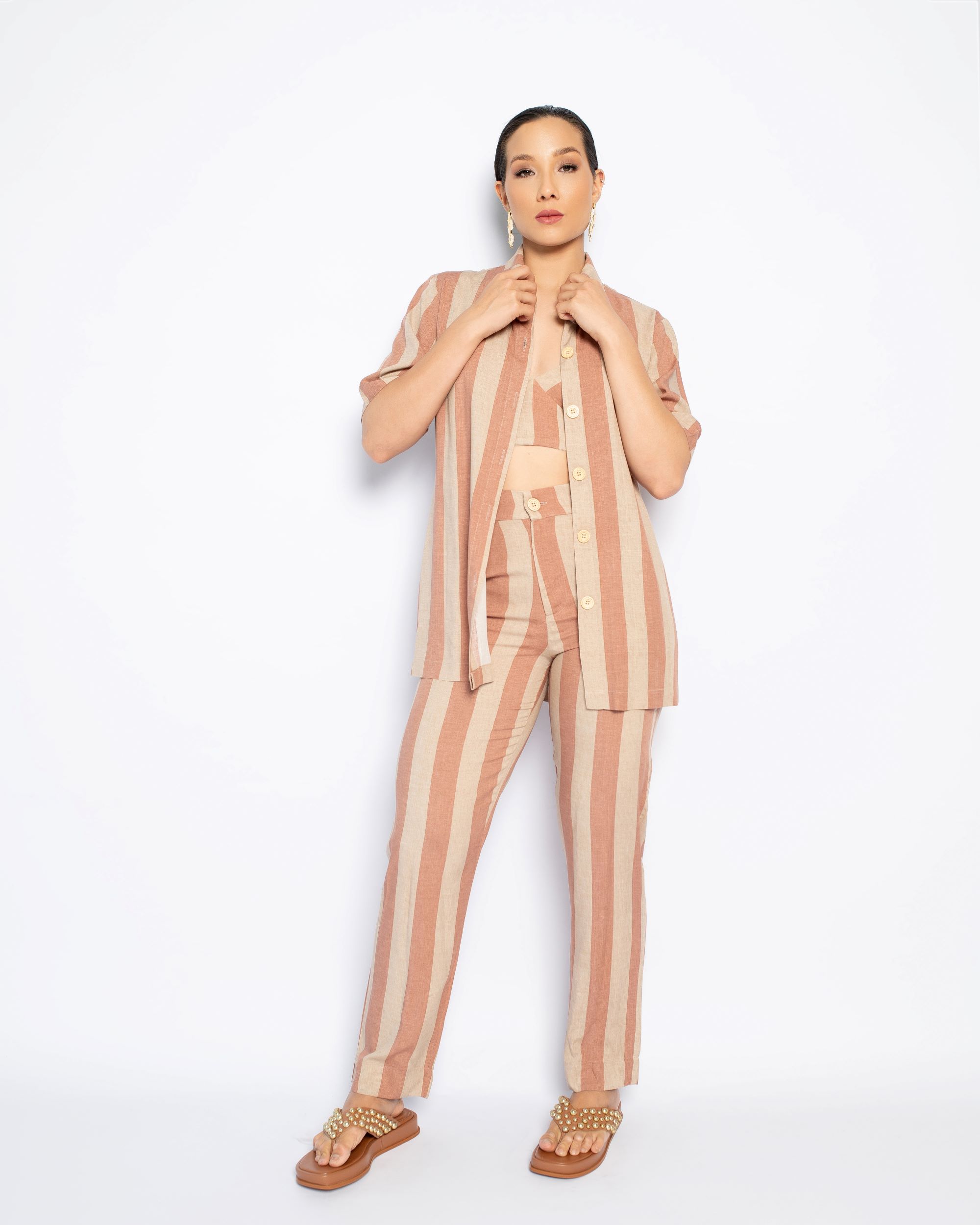 Conjunto composto por calça, top e camisa. Calça modelo reto, top de alça com costas em elastex e camisa alongada de manga curta.