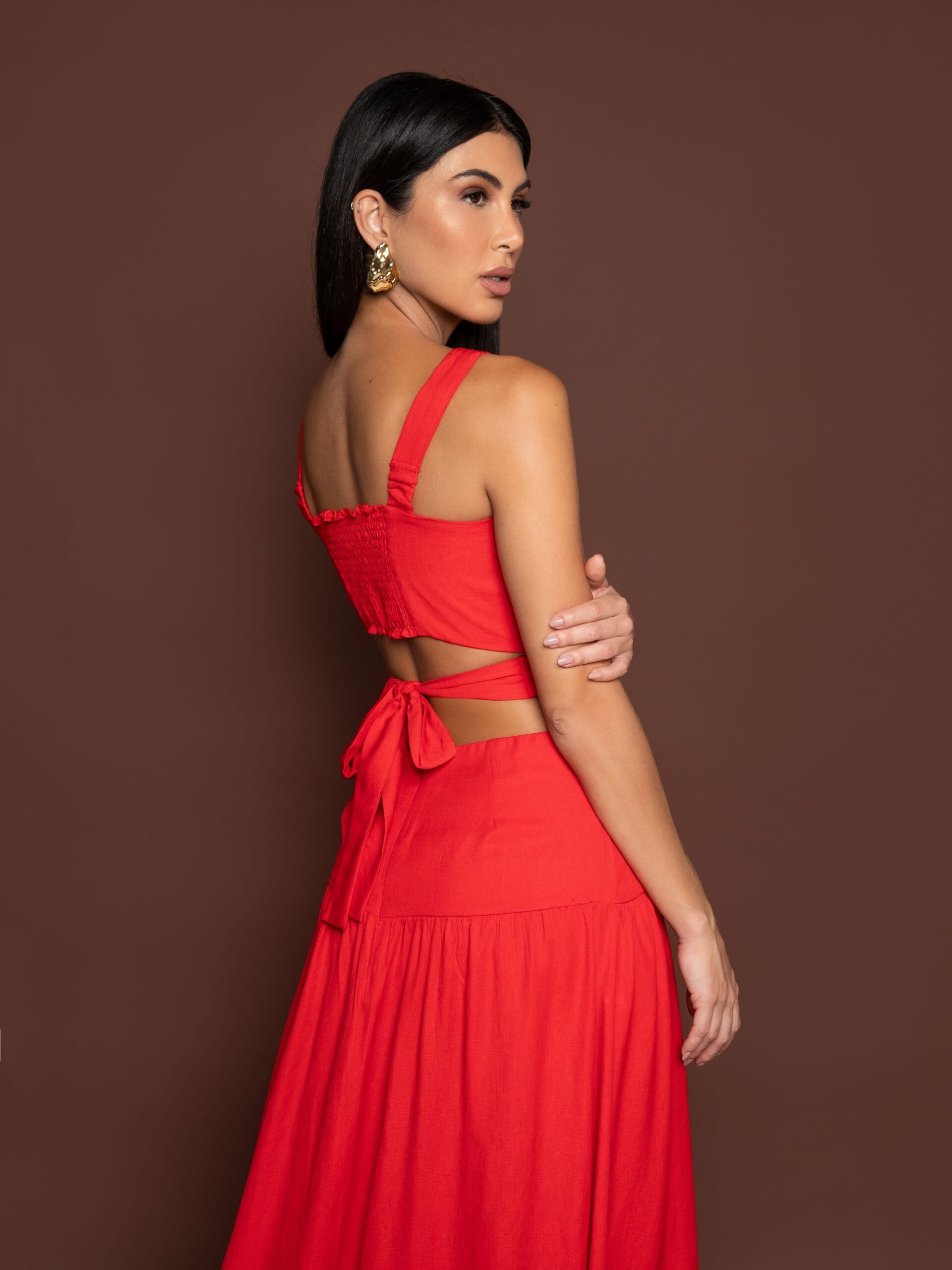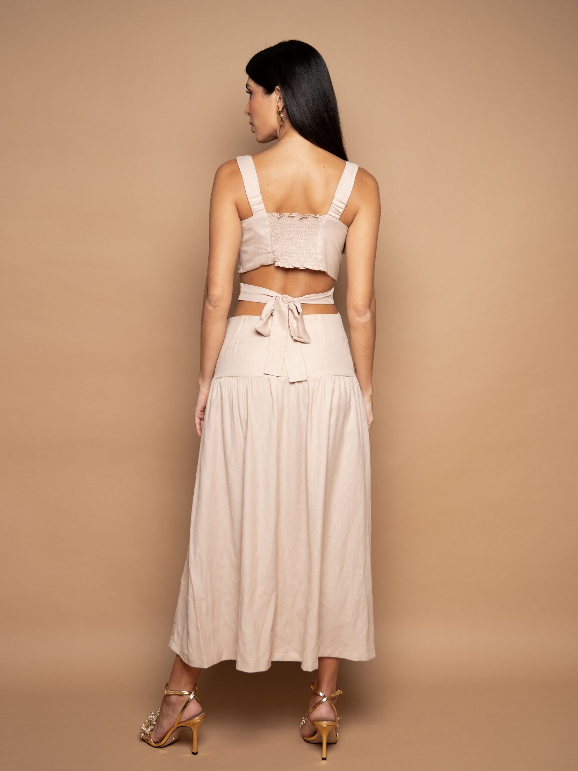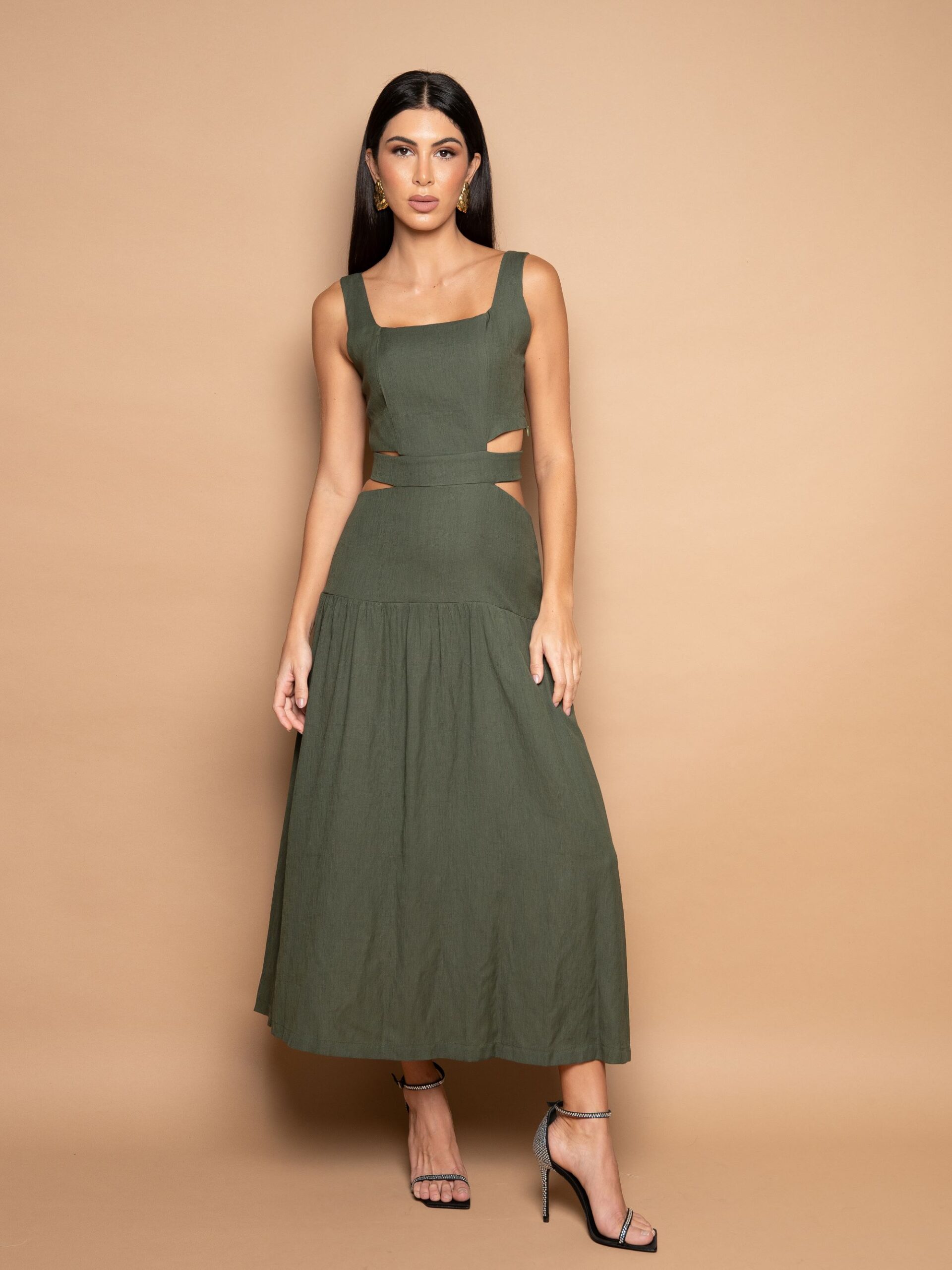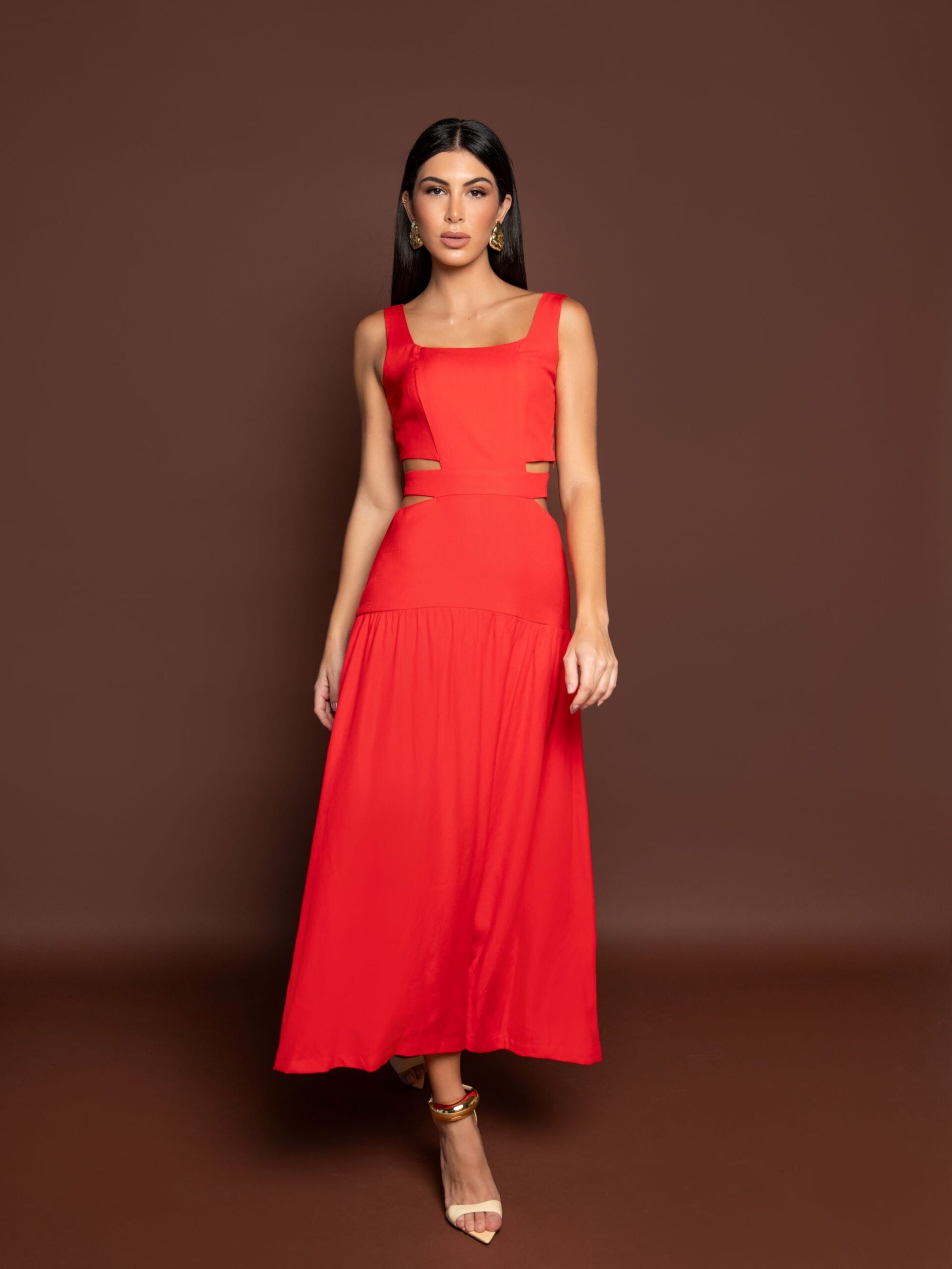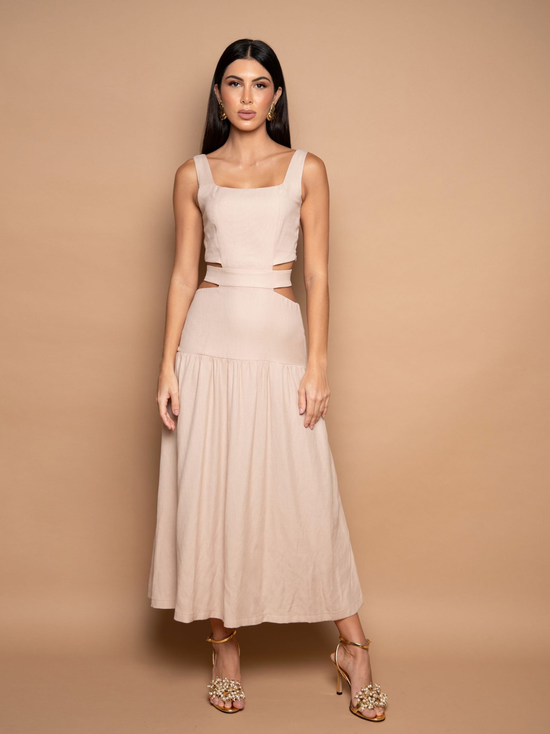 Vestido longo com alças grossas, decote reto, recortes na cintura e costas com elástico, laço e zíper no centro costas.