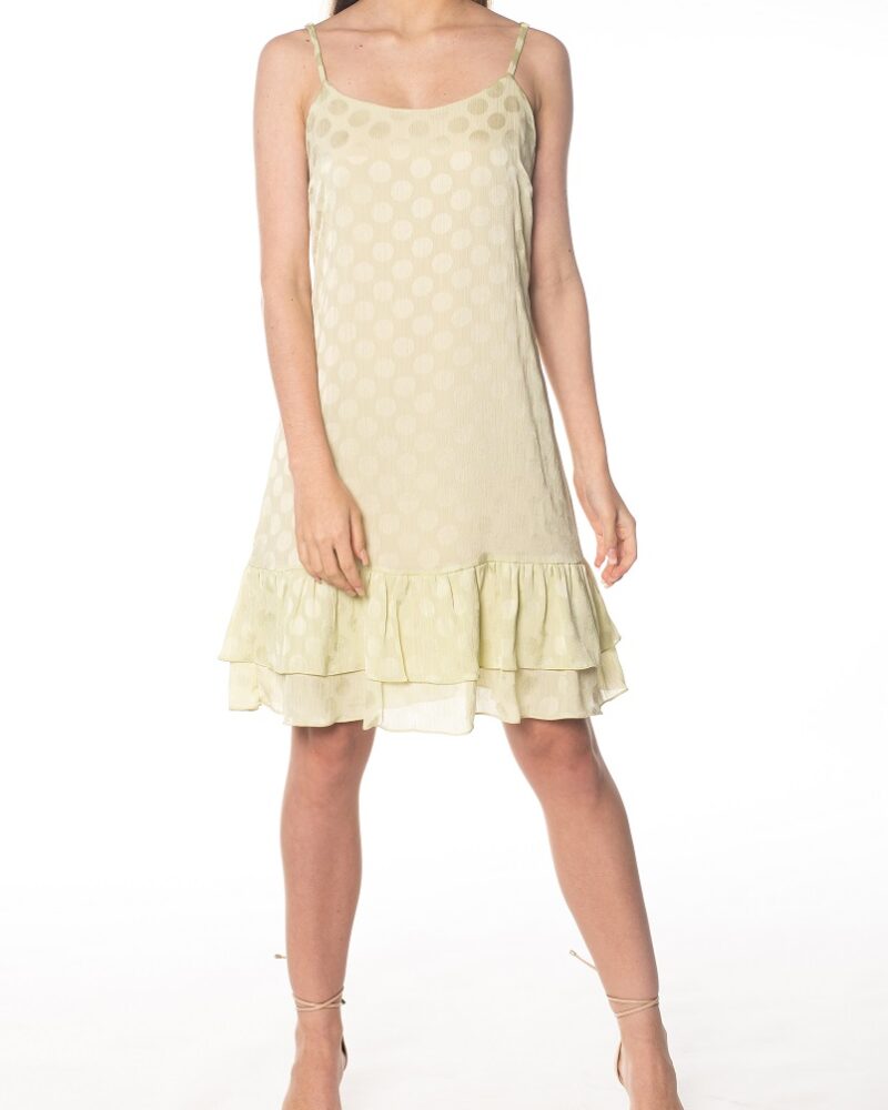 Vestido em crepe texturizado, de alças finas e regulador e babado duplo na barra. Peça forrada.