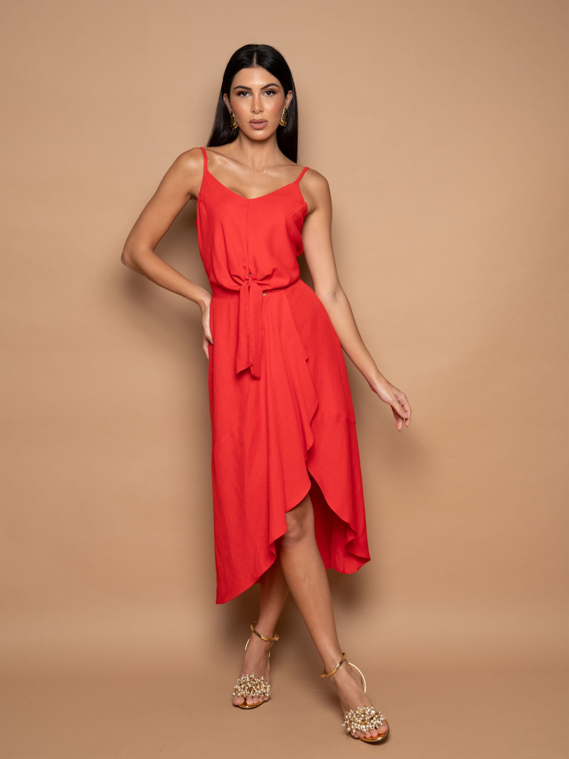 Vestido de alças finas, decote V, laço no centro da cintura, barra com babado transpassado.