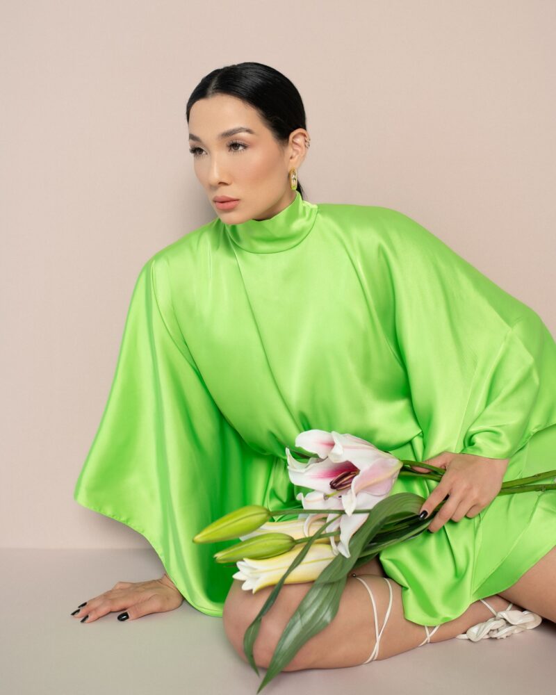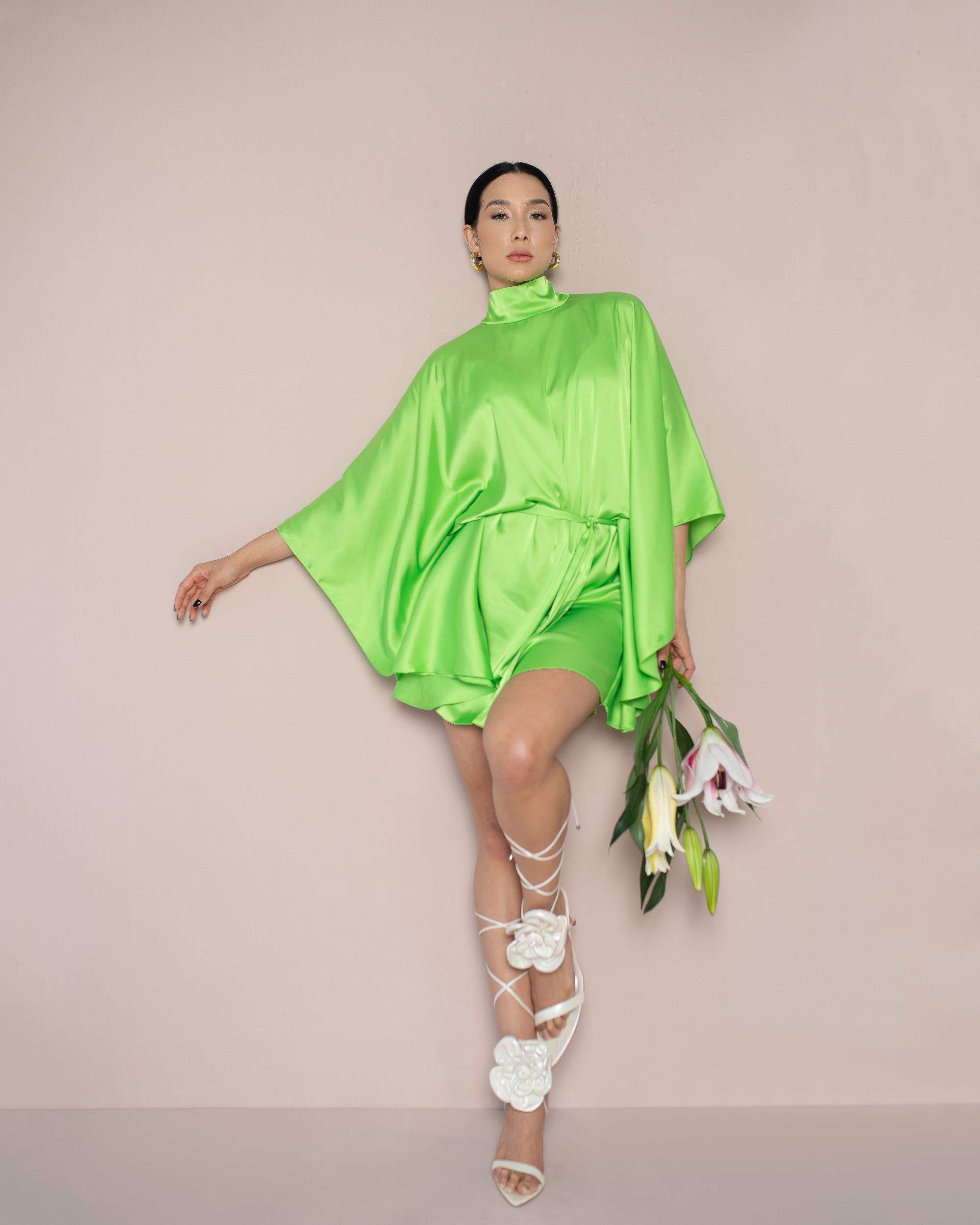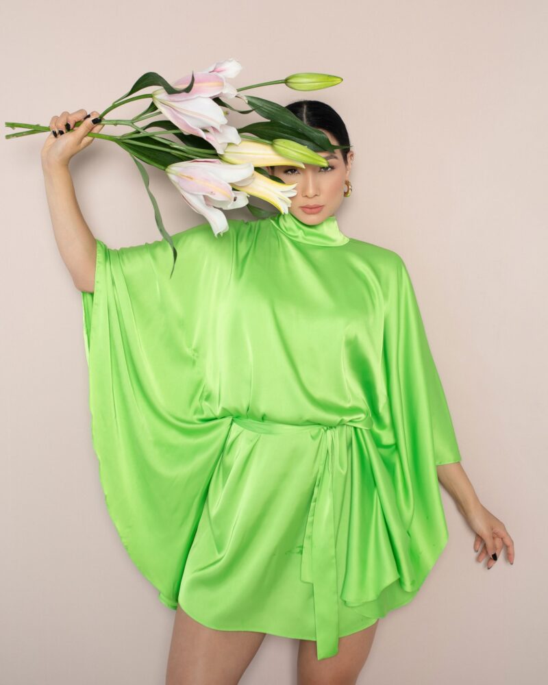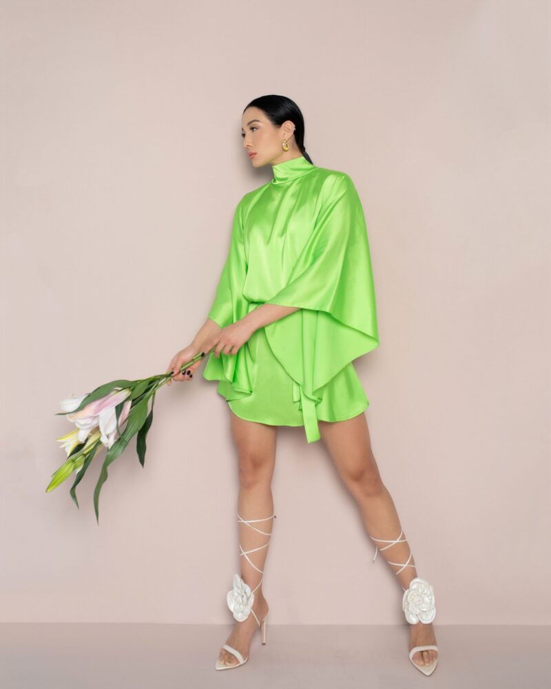 Vestido em seda acetinada com modelagem ampla e faixa no mesmo tecido.