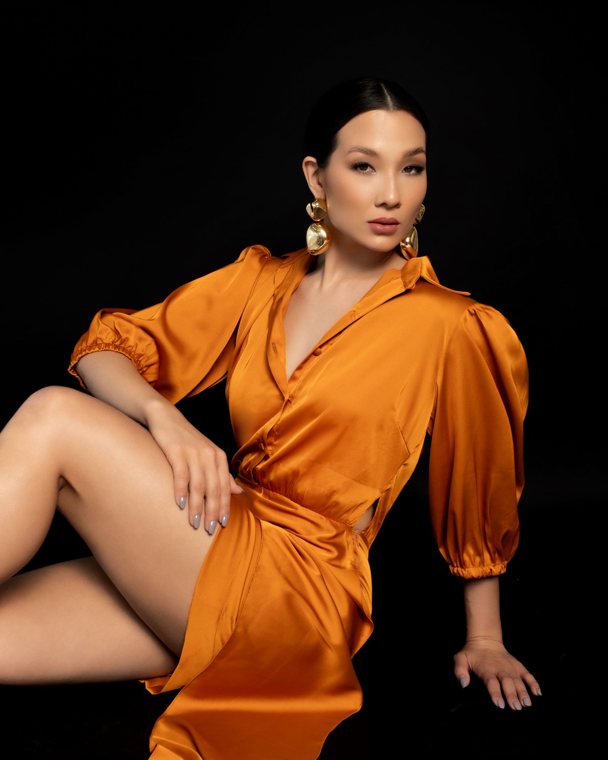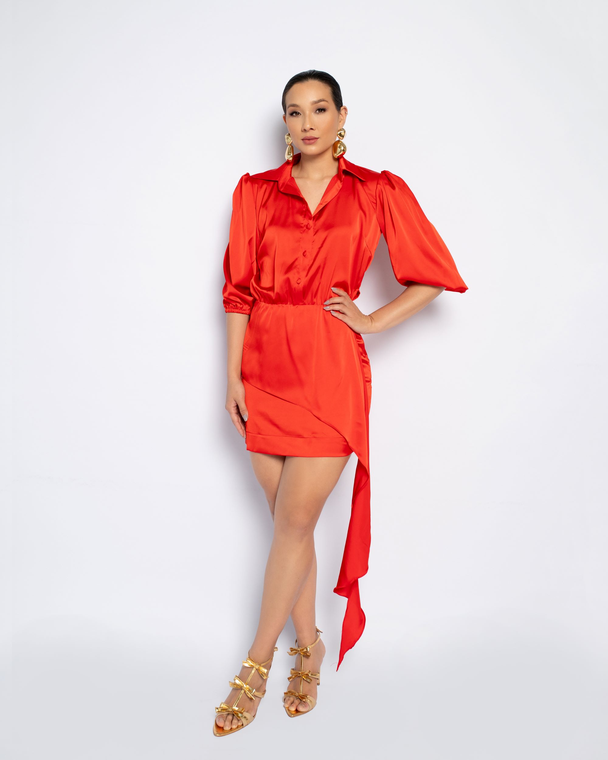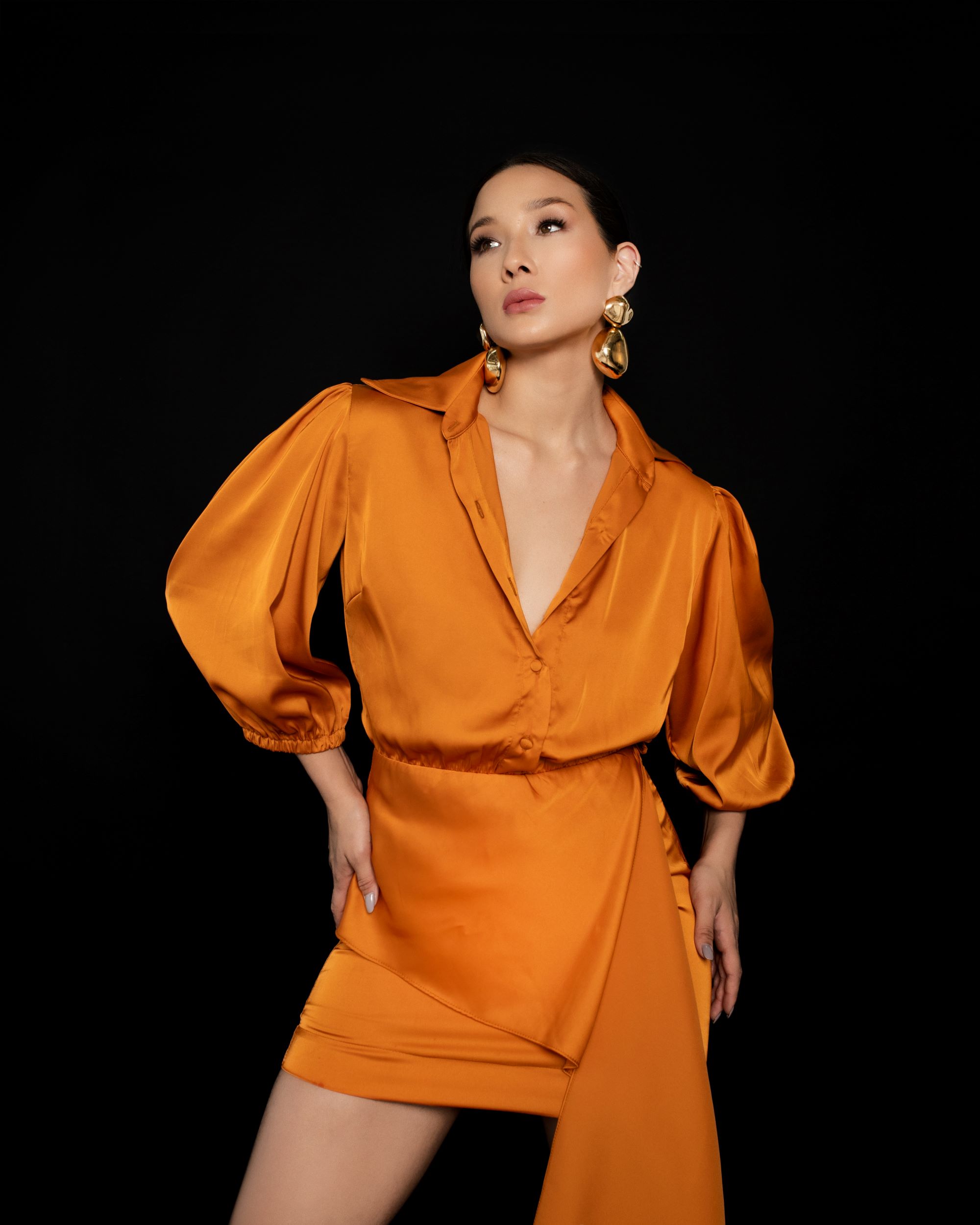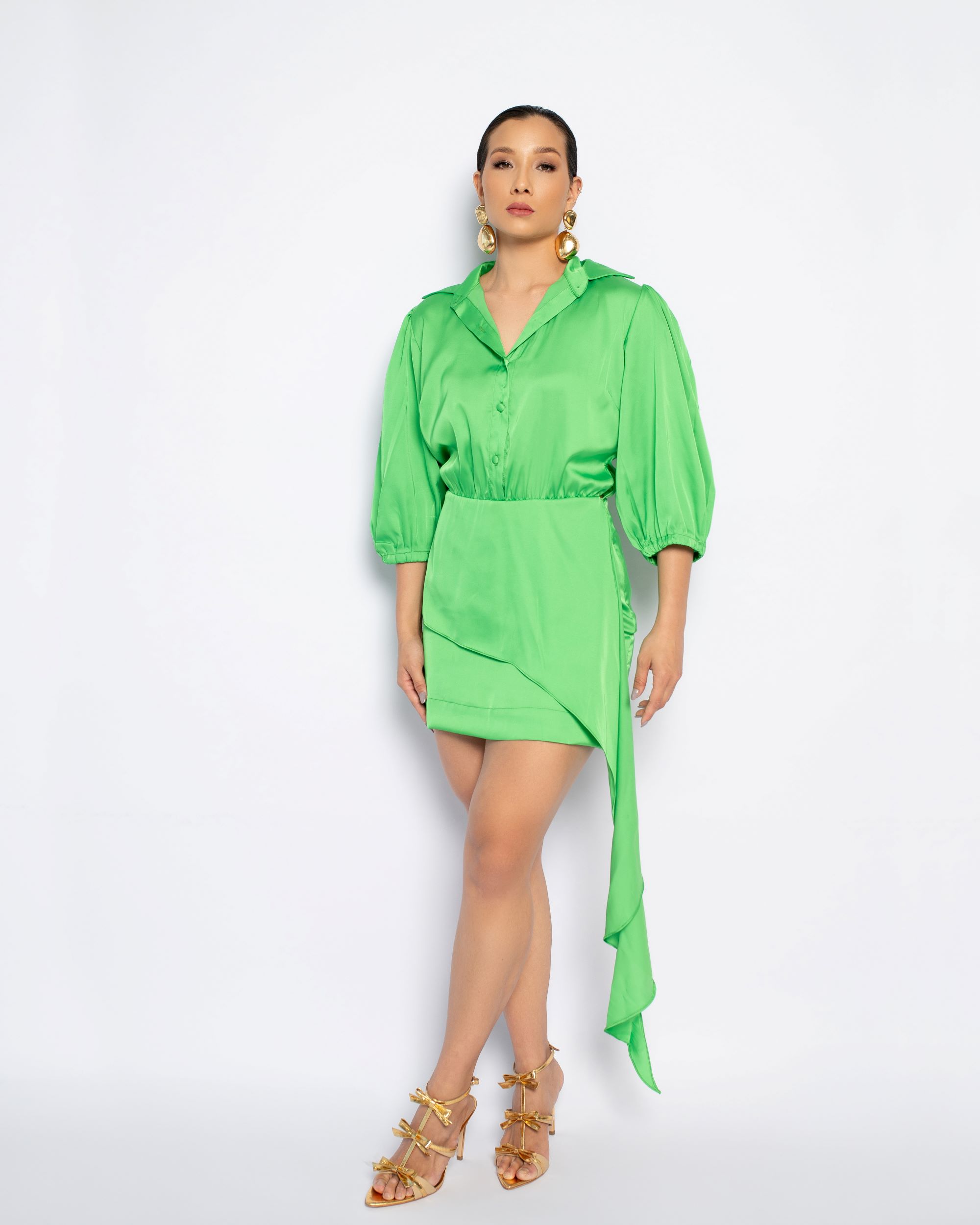 Vestido em seda acetinada com botões frontais e punho em elástico.