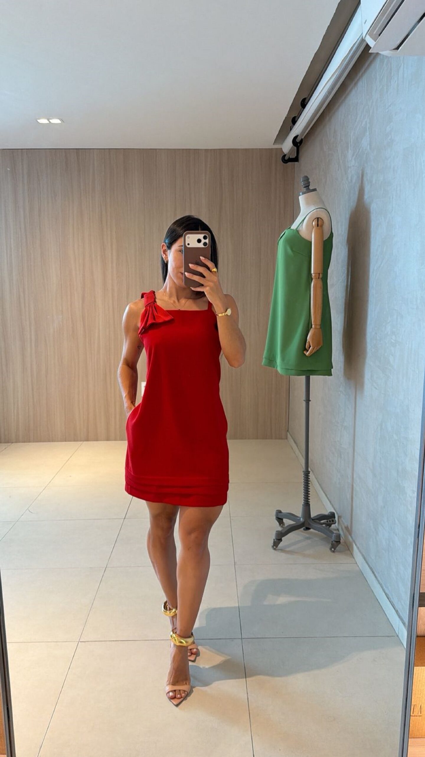 Vestido curto com decote quadrado e barra dupla, alças finas, bolsos nas laterais, com fecho em zíper nas costas e detalhe de laço na alça esquerda.