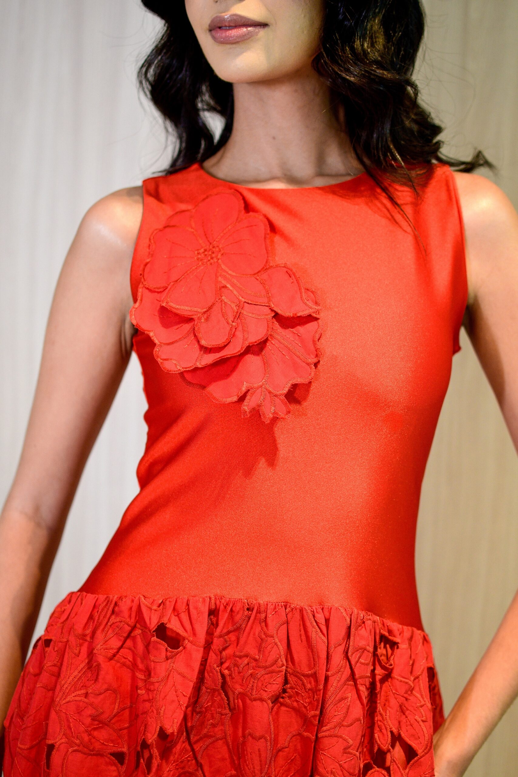 Vestido midi sem manga e gola redonda, com aplicação de flor no colo e fecho traseiro em zíper invisível.