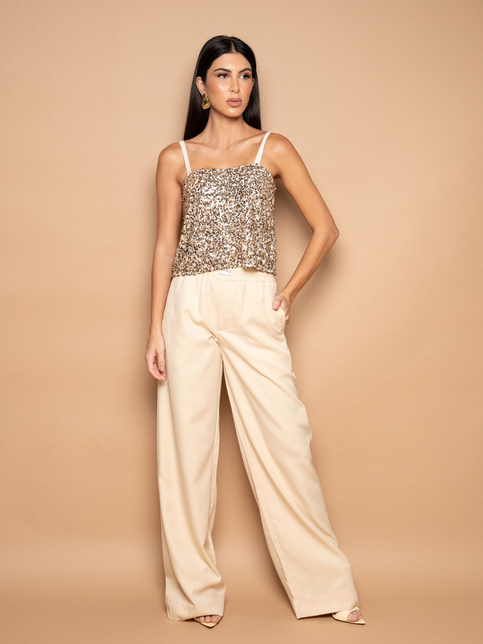 R$154.00O preço original era: R$154.00.R$123.20O preço atual é: R$123.20.Blusa em paetê com alça fina e recote reto. Composição: 95% Poliéster; 5 % Elastano.